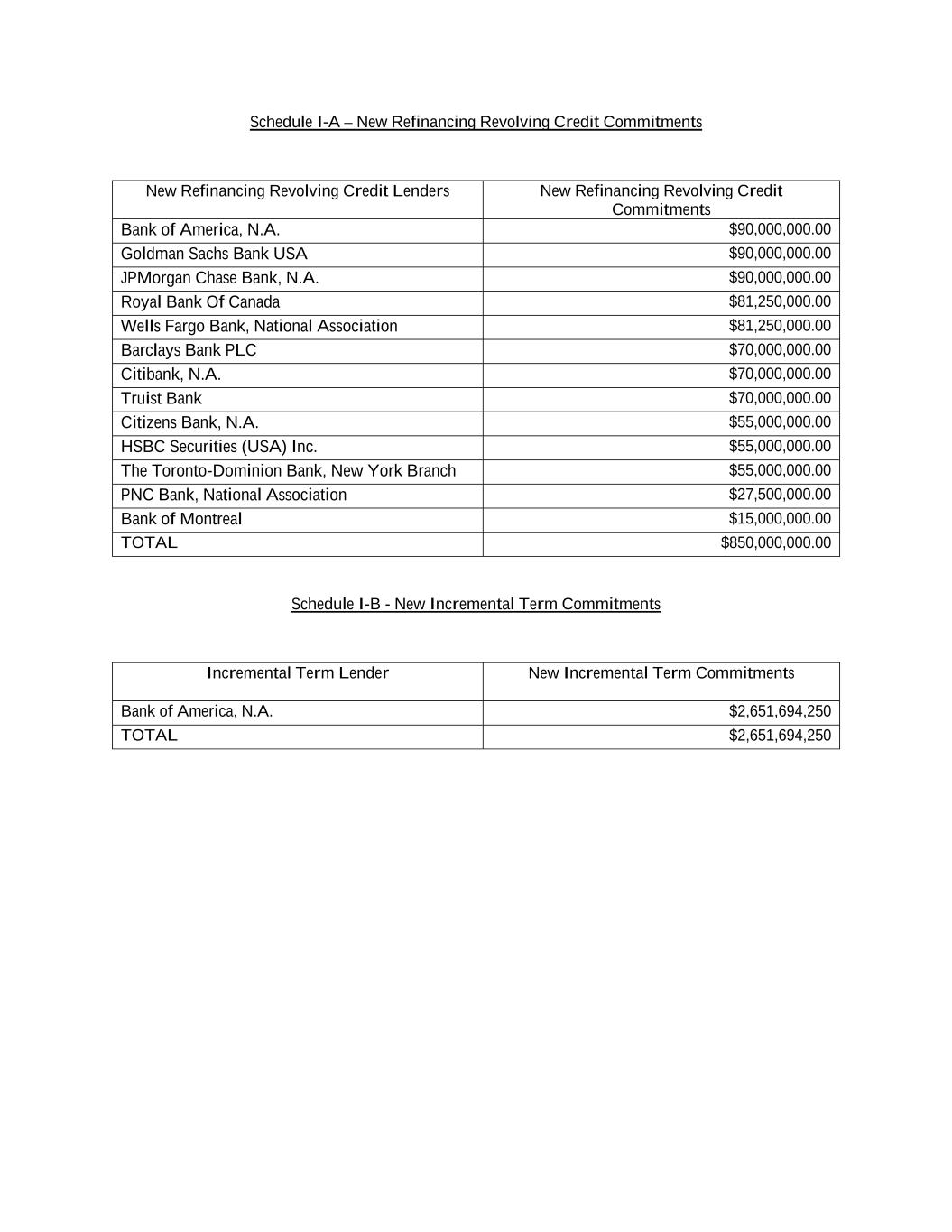 Schedule I-A – New Refinancing Revolving Credit Commitments Schedule I-B - New Incremental Term Commitments New Refinancing Revolving Credit Lenders New Refinancing Revolving Credit Commitments Bank of America, N.A. $90,000,000.00 Goldman Sachs Bank USA $90,000,000.00 JPMorgan Chase Bank, N.A. $90,000,000.00 Royal Bank Of Canada $81,250,000.00 Wells Fargo Bank, National Association $81,250,000.00 Barclays Bank PLC $70,000,000.00 Citibank, N.A. $70,000,000.00 Truist Bank $70,000,000.00 Citizens Bank, N.A. $55,000,000.00 HSBC Securities (USA) Inc. $55,000,000.00 The Toronto-Dominion Bank, New York Branch $55,000,000.00 PNC Bank, National Association $27,500,000.00 Bank of Montreal $15,000,000.00 TOTAL $850,000,000.00 Incremental Term Lender New Incremental Term Commitments Bank of America, N.A. $2,651,694,250 TOTAL $2,651,694,250