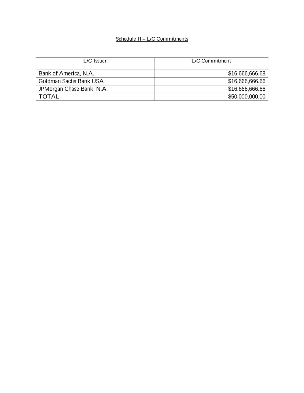 Schedule II – L/C Commitments L/C Issuer L/C Commitment Bank of America, N.A. $16,666,666.68 Goldman Sachs Bank USA $16,666,666.66 JPMorgan Chase Bank, N.A. $16,666,666.66 TOTAL $50,000,000.00