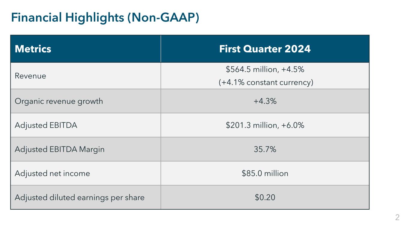 Restricted Confidential Financial Highlights (Non-GAAP) Metrics First Quarter 2024 Revenue $564.5 million, +4.5% (+4.1% constant currency) Organic revenue growth +4.3% Adjusted EBITDA $201.3 million, +6.0% Adjusted EBITDA Margin 35.7% Adjusted net income $85.0 million Adjusted diluted earnings per share $0.20 2