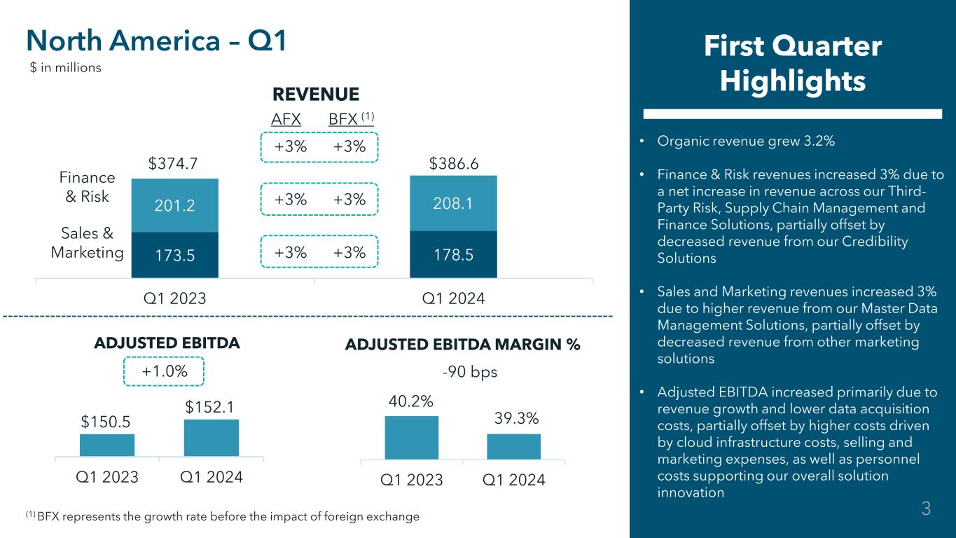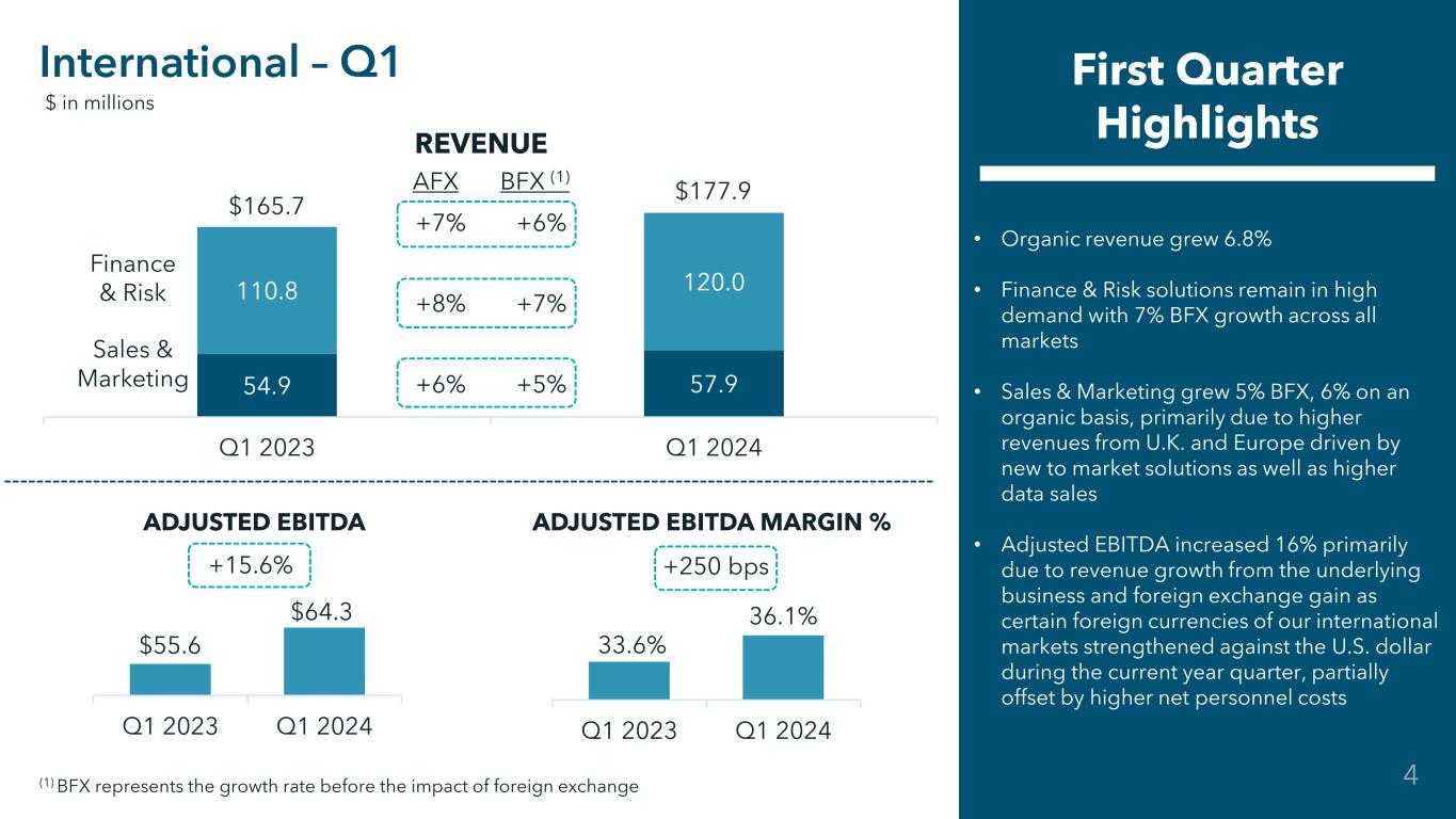 Restricted Confidential 173.5 178.5 201.2 208.1 Q1 2023 Q1 2024 +3% +3% +3% +3% +3% +3% • Organic revenue grew 3.2% • Finance & Risk revenues increased 3% due to a net increase in revenue across our Third- Party Risk, Supply Chain Management and Finance Solutions, partially offset by decreased revenue from our Credibility Solutions • Sales and Marketing revenues increased 3% due to higher revenue from our Master Data Management Solutions, partially offset by decreased revenue from other marketing solutions • Adjusted EBITDA increased primarily due to revenue growth and lower data acquisition costs, partially offset by higher costs driven by cloud infrastructure costs, selling and marketing expenses, as well as personnel costs supporting our overall solution innovation North America – Q1 First Quarter Highlights Finance & Risk Sales & Marketing $374.7 $386.6 AFX BFX (1) $ in millions REVENUE ADJUSTED EBITDA ADJUSTED EBITDA MARGIN % $150.5 $152.1 Q1 2023 Q1 2024 40.2% 39.3% Q1 2023 Q1 2024 +1.0% -90 bps (1) BFX represents the growth rate before the impact of foreign exchange 3