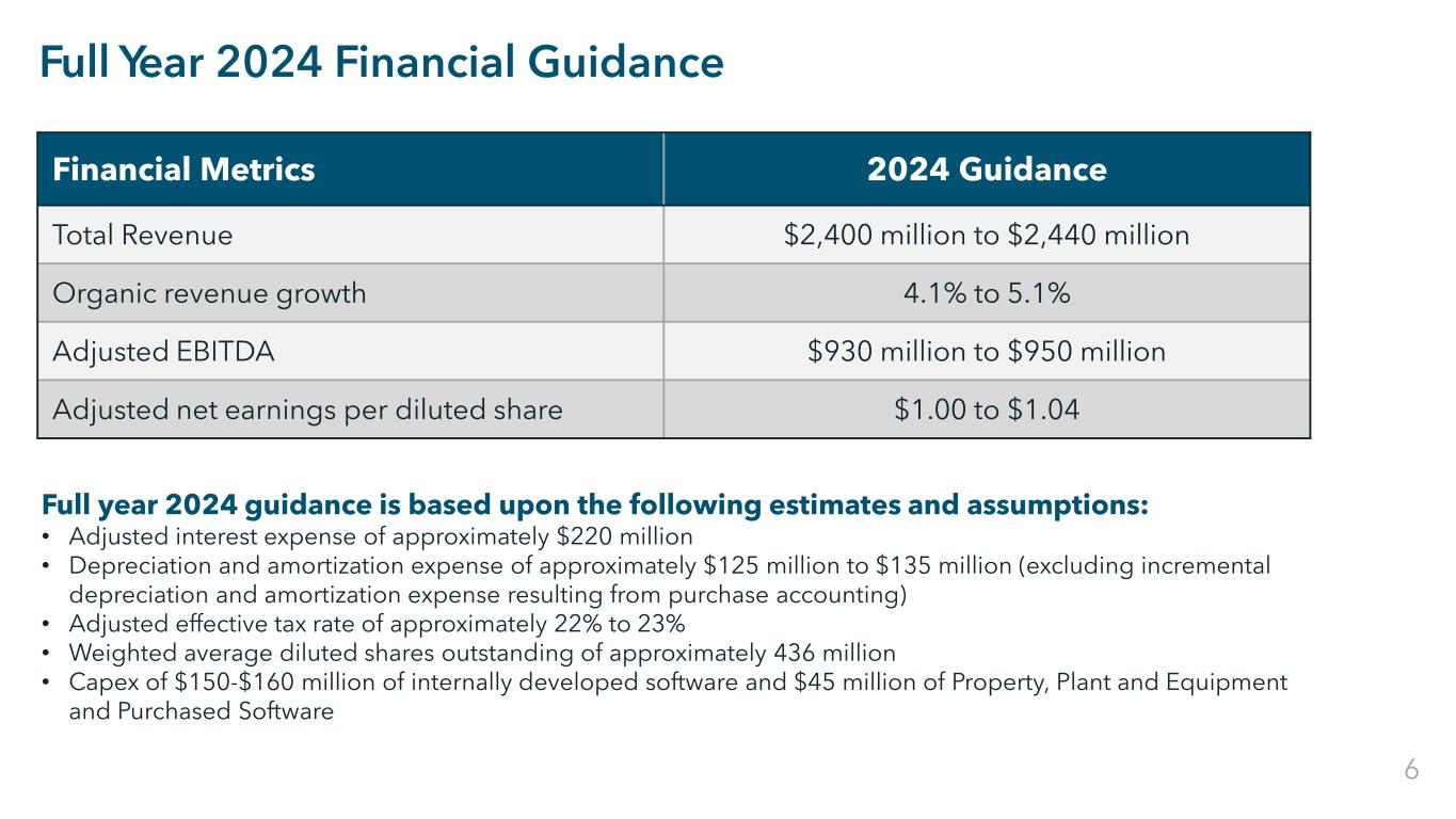 Restricted Confidential Full Year 2024 Financial Guidance Financial Metrics 2024 Guidance Total Revenue $2,400 million to $2,440 million Organic revenue growth 4.1% to 5.1% Adjusted EBITDA $930 million to $950 million Adjusted net earnings per diluted share $1.00 to $1.04 Full year 2024 guidance is based upon the following estimates and assumptions: • Adjusted interest expense of approximately $220 million • Depreciation and amortization expense of approximately $125 million to $135 million (excluding incremental depreciation and amortization expense resulting from purchase accounting) • Adjusted effective tax rate of approximately 22% to 23% • Weighted average diluted shares outstanding of approximately 436 million • Capex of $150-$160 million of internally developed software and $45 million of Property, Plant and Equipment and Purchased Software 6
