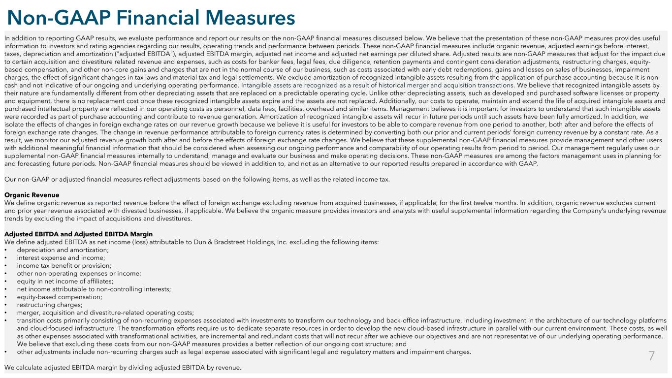 Restricted Confidential Non-GAAP Financial Measures In addition to reporting GAAP results, we evaluate performance and report our results on the non-GAAP financial measures discussed below. We believe that the presentation of these non-GAAP measures provides useful information to investors and rating agencies regarding our results, operating trends and performance between periods. These non-GAAP financial measures include organic revenue, adjusted earnings before interest, taxes, depreciation and amortization ("adjusted EBITDA"), adjusted EBITDA margin, adjusted net income and adjusted net earnings per diluted share. Adjusted results are non-GAAP measures that adjust for the impact due to certain acquisition and divestiture related revenue and expenses, such as costs for banker fees, legal fees, due diligence, retention payments and contingent consideration adjustments, restructuring charges, equity- based compensation, and other non-core gains and charges that are not in the normal course of our business, such as costs associated with early debt redemptions, gains and losses on sales of businesses, impairment charges, the effect of significant changes in tax laws and material tax and legal settlements. We exclude amortization of recognized intangible assets resulting from the application of purchase accounting because it is non- cash and not indicative of our ongoing and underlying operating performance. Intangible assets are recognized as a result of historical merger and acquisition transactions. We believe that recognized intangible assets by their nature are fundamentally different from other depreciating assets that are replaced on a predictable operating cycle. Unlike other depreciating assets, such as developed and purchased software licenses or property and equipment, there is no replacement cost once these recognized intangible assets expire and the assets are not replaced. Additionally, our costs to operate, maintain and extend the life of acquired intangible assets and purchased intellectual property are reflected in our operating costs as personnel, data fees, facilities, overhead and similar items. Management believes it is important for investors to understand that such intangible assets were recorded as part of purchase accounting and contribute to revenue generation. Amortization of recognized intangible assets will recur in future periods until such assets have been fully amortized. In addition, we isolate the effects of changes in foreign exchange rates on our revenue growth because we believe it is useful for investors to be able to compare revenue from one period to another, both after and before the effects of foreign exchange rate changes. The change in revenue performance attributable to foreign currency rates is determined by converting both our prior and current periods’ foreign currency revenue by a constant rate. As a result, we monitor our adjusted revenue growth both after and before the effects of foreign exchange rate changes. We believe that these supplemental non-GAAP financial measures provide management and other users with additional meaningful financial information that should be considered when assessing our ongoing performance and comparability of our operating results from period to period. Our management regularly uses our supplemental non-GAAP financial measures internally to understand, manage and evaluate our business and make operating decisions. These non-GAAP measures are among the factors management uses in planning for and forecasting future periods. Non-GAAP financial measures should be viewed in addition to, and not as an alternative to our reported results prepared in accordance with GAAP. Our non-GAAP or adjusted financial measures reflect adjustments based on the following items, as well as the related income tax. Organic Revenue We define organic revenue as reported revenue before the effect of foreign exchange excluding revenue from acquired businesses, if applicable, for the first twelve months. In addition, organic revenue excludes current and prior year revenue associated with divested businesses, if applicable. We believe the organic measure provides investors and analysts with useful supplemental information regarding the Company’s underlying revenue trends by excluding the impact of acquisitions and divestitures. Adjusted EBITDA and Adjusted EBITDA Margin We define adjusted EBITDA as net income (loss) attributable to Dun & Bradstreet Holdings, Inc. excluding the following items: • depreciation and amortization; • interest expense and income; • income tax benefit or provision; • other non-operating expenses or income; • equity in net income of affiliates; • net income attributable to non-controlling interests; • equity-based compensation; • restructuring charges; • merger, acquisition and divestiture-related operating costs; • transition costs primarily consisting of non-recurring expenses associated with investments to transform our technology and back-office infrastructure, including investment in the architecture of our technology platforms and cloud-focused infrastructure. The transformation efforts require us to dedicate separate resources in order to develop the new cloud-based infrastructure in parallel with our current environment. These costs, as well as other expenses associated with transformational activities, are incremental and redundant costs that will not recur after we achieve our objectives and are not representative of our underlying operating performance. We believe that excluding these costs from our non-GAAP measures provides a better reflection of our ongoing cost structure; and • other adjustments include non-recurring charges such as legal expense associated with significant legal and regulatory matters and impairment charges. We calculate adjusted EBITDA margin by dividing adjusted EBITDA by revenue. 7