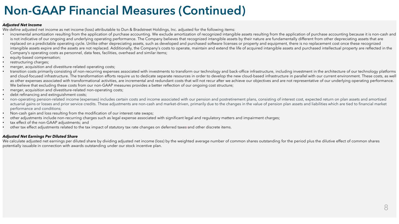 Restricted Confidential Non-GAAP Financial Measures (Continued) Adjusted Net Income We define adjusted net income as net income (loss) attributable to Dun & Bradstreet Holdings, Inc. adjusted for the following items: • incremental amortization resulting from the application of purchase accounting. We exclude amortization of recognized intangible assets resulting from the application of purchase accounting because it is non-cash and is not indicative of our ongoing and underlying operating performance. The Company believes that recognized intangible assets by their nature are fundamentally different from other depreciating assets that are replaced on a predictable operating cycle. Unlike other depreciating assets, such as developed and purchased software licenses or property and equipment, there is no replacement cost once these recognized intangible assets expire and the assets are not replaced. Additionally, the Company’s costs to operate, maintain and extend the life of acquired intangible assets and purchased intellectual property are reflected in the Company’s operating costs as personnel, data fees, facilities, overhead and similar items; • equity-based compensation; • restructuring charges; • merger, acquisition and divestiture-related operating costs; • transition costs primarily consisting of non-recurring expenses associated with investments to transform our technology and back-office infrastructure, including investment in the architecture of our technology platforms and cloud-focused infrastructure. The transformation efforts require us to dedicate separate resources in order to develop the new cloud-based infrastructure in parallel with our current environment. These costs, as well as other expenses associated with transformational activities, are incremental and redundant costs that will not recur after we achieve our objectives and are not representative of our underlying operating performance. We believe that excluding these costs from our non-GAAP measures provides a better reflection of our ongoing cost structure; • merger, acquisition and divestiture-related non-operating costs; • debt refinancing and extinguishment costs; • non-operating pension-related income (expenses) includes certain costs and income associated with our pension and postretirement plans, consisting of interest cost, expected return on plan assets and amortized actuarial gains or losses and prior service credits. These adjustments are non-cash and market-driven, primarily due to the changes in the value of pension plan assets and liabilities which are tied to financial market performance and conditions; • Non-cash gain and loss resulting from the modification of our interest rate swaps; • other adjustments include non-recurring charges such as legal expense associated with significant legal and regulatory matters and impairment charges; • tax effect of the non-GAAP adjustments; and • other tax effect adjustments related to the tax impact of statutory tax rate changes on deferred taxes and other discrete items. Adjusted Net Earnings Per Diluted Share We calculate adjusted net earnings per diluted share by dividing adjusted net income (loss) by the weighted average number of common shares outstanding for the period plus the dilutive effect of common shares potentially issuable in connection with awards outstanding under our stock incentive plan. 8