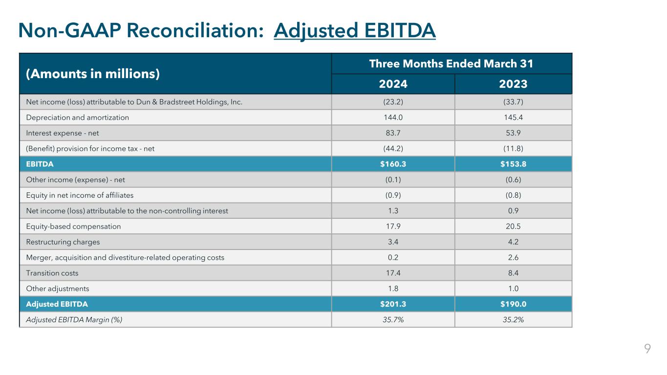 Restricted Confidential Non-GAAP Reconciliation: Adjusted EBITDA (Amounts in millions) Three Months Ended March 31 2024 2023 Net income (loss) attributable to Dun & Bradstreet Holdings, Inc. (23.2) (33.7) Depreciation and amortization 144.0 145.4 Interest expense - net 83.7 53.9 (Benefit) provision for income tax - net (44.2) (11.8) EBITDA $160.3 $153.8 Other income (expense) - net (0.1) (0.6) Equity in net income of affiliates (0.9) (0.8) Net income (loss) attributable to the non-controlling interest 1.3 0.9 Equity-based compensation 17.9 20.5 Restructuring charges 3.4 4.2 Merger, acquisition and divestiture-related operating costs 0.2 2.6 Transition costs 17.4 8.4 Other adjustments 1.8 1.0 Adjusted EBITDA $201.3 $190.0 Adjusted EBITDA Margin (%) 35.7% 35.2% 9