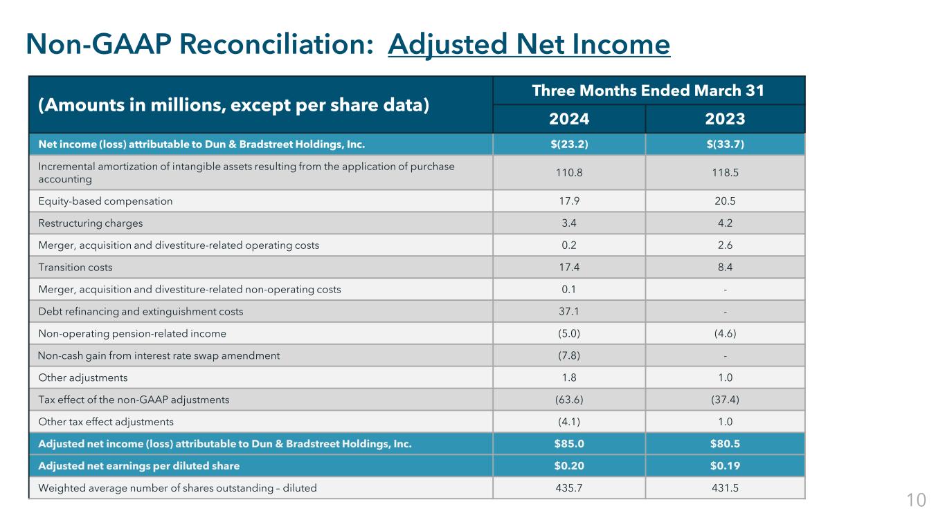 Restricted Confidential Non-GAAP Reconciliation: Adjusted Net Income (Amounts in millions, except per share data) Three Months Ended March 31 2024 2023 Net income (loss) attributable to Dun & Bradstreet Holdings, Inc. $(23.2) $(33.7) Incremental amortization of intangible assets resulting from the application of purchase accounting 110.8 118.5 Equity-based compensation 17.9 20.5 Restructuring charges 3.4 4.2 Merger, acquisition and divestiture-related operating costs 0.2 2.6 Transition costs 17.4 8.4 Merger, acquisition and divestiture-related non-operating costs 0.1 - Debt refinancing and extinguishment costs 37.1 - Non-operating pension-related income (5.0) (4.6) Non-cash gain from interest rate swap amendment (7.8) - Other adjustments 1.8 1.0 Tax effect of the non-GAAP adjustments (63.6) (37.4) Other tax effect adjustments (4.1) 1.0 Adjusted net income (loss) attributable to Dun & Bradstreet Holdings, Inc. $85.0 $80.5 Adjusted net earnings per diluted share $0.20 $0.19 Weighted average number of shares outstanding – diluted 435.7 431.5 10