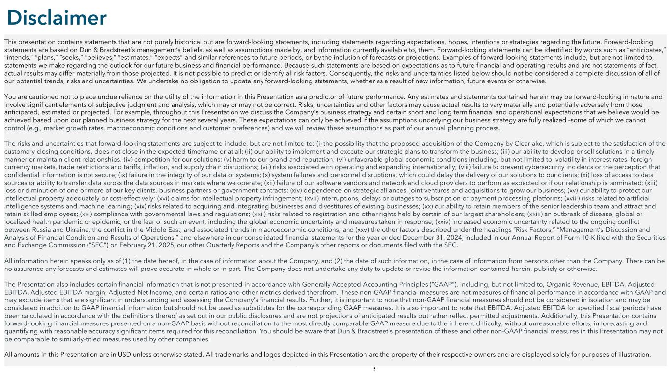 Commercial in Confidence Disclaimer This presentation contains statements that are not purely historical but are forward-looking statements, including statements regarding expectations, hopes, intentions or strategies regarding the future. Forward-looking statements are based on Dun & Bradstreet’s management’s beliefs, as well as assumptions made by, and information currently available to, them. Forward-looking statements can be identified by words such as “anticipates,” “intends,” “plans,” “seeks,” “believes,” “estimates,” “expects” and similar references to future periods, or by the inclusion of forecasts or projections. Examples of forward-looking statements include, but are not limited to, statements we make regarding the outlook for our future business and financial performance. Because such statements are based on expectations as to future financial and operating results and are not statements of fact, actual results may differ materially from those projected. It is not possible to predict or identify all risk factors. Consequently, the risks and uncertainties listed below should not be considered a complete discussion of all of our potential trends, risks and uncertainties. We undertake no obligation to update any forward-looking statements, whether as a result of new information, future events or otherwise. You are cautioned not to place undue reliance on the utility of the information in this Presentation as a predictor of future performance. Any estimates and statements contained herein may be forward-looking in nature and involve significant elements of subjective judgment and analysis, which may or may not be correct. Risks, uncertainties and other factors may cause actual results to vary materially and potentially adversely from those anticipated, estimated or projected. For example, throughout this Presentation we discuss the Company’s business strategy and certain short and long term financial and operational expectations that we believe would be achieved based upon our planned business strategy for the next several years. These expectations can only be achieved if the assumptions underlying our business strategy are fully realized –some of which we cannot control (e.g., market growth rates, macroeconomic conditions and customer preferences) and we will review these assumptions as part of our annual planning process. The risks and uncertainties that forward-looking statements are subject to include, but are not limited to: (i) the possibility that the proposed acquisition of the Company by Clearlake, which is subject to the satisfaction of the customary closing conditions, does not close in the expected timeframe or at all; (ii) our ability to implement and execute our strategic plans to transform the business; (iii) our ability to develop or sell solutions in a timely manner or maintain client relationships; (iv) competition for our solutions; (v) harm to our brand and reputation; (vi) unfavorable global economic conditions including, but not limited to, volatility in interest rates, foreign currency markets, trade restrictions and tariffs, inflation, and supply chain disruptions; (vii) risks associated with operating and expanding internationally; (viii) failure to prevent cybersecurity incidents or the perception that confidential information is not secure; (ix) failure in the integrity of our data or systems; (x) system failures and personnel disruptions, which could delay the delivery of our solutions to our clients; (xi) loss of access to data sources or ability to transfer data across the data sources in markets where we operate; (xii) failure of our software vendors and network and cloud providers to perform as expected or if our relationship is terminated; (xiii) loss or diminution of one or more of our key clients, business partners or government contracts; (xiv) dependence on strategic alliances, joint ventures and acquisitions to grow our business; (xv) our ability to protect our intellectual property adequately or cost-effectively; (xvi) claims for intellectual property infringement; (xvii) interruptions, delays or outages to subscription or payment processing platforms; (xviii) risks related to artificial intelligence systems and machine learning; (xix) risks related to acquiring and integrating businesses and divestitures of existing businesses; (xx) our ability to retain members of the senior leadership team and attract and retain skilled employees; (xxi) compliance with governmental laws and regulations; (xxii) risks related to registration and other rights held by certain of our largest shareholders; (xxiii) an outbreak of disease, global or localized health pandemic or epidemic, or the fear of such an event, including the global economic uncertainty and measures taken in response; (xxiv) increased economic uncertainty related to the ongoing conflict between Russia and Ukraine, the conflict in the Middle East, and associated trends in macroeconomic conditions, and (xxv) the other factors described under the headings “Risk Factors,” “Management’s Discussion and Analysis of Financial Condition and Results of Operations,” and elsewhere in our consolidated financial statements for the year ended December 31, 2024, included in our Annual Report of Form 10-K filed with the Securities and Exchange Commission ("SEC") on February 21, 2025, our other Quarterly Reports and the Company’s other reports or documents filed with the SEC. All information herein speaks only as of (1) the date hereof, in the case of information about the Company, and (2) the date of such information, in the case of information from persons other than the Company. There can be no assurance any forecasts and estimates will prove accurate in whole or in part. The Company does not undertake any duty to update or revise the information contained herein, publicly or otherwise. The Presentation also includes certain financial information that is not 