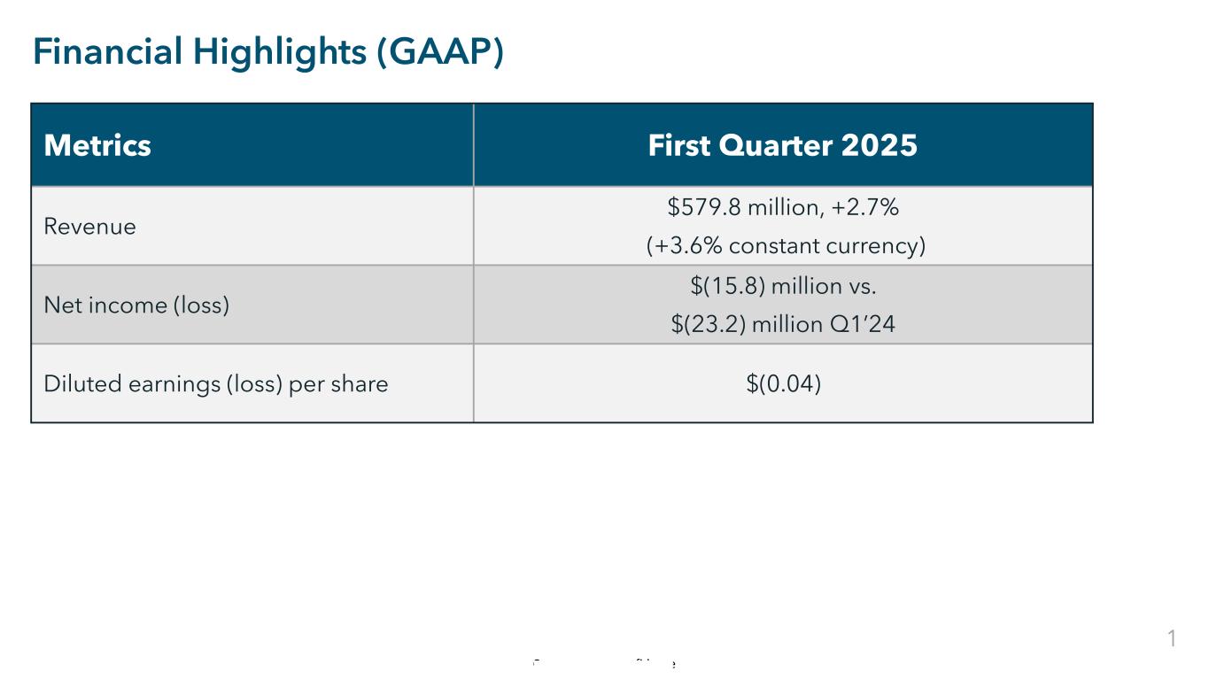 Commercial in Confidence Financial Highlights (GAAP) Metrics First Quarter 2025 Revenue $579.8 million, +2.7% (+3.6% constant currency) Net income (loss) $(15.8) million vs. $(23.2) million Q1’24 Diluted earnings (loss) per share $(0.04) 1