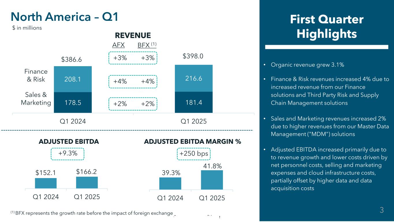 Commercial in Confidence 178.5 181.4 208.1 216.6 Q1 2024 Q1 2025 +3% +3% +4% +4% +2% +2% • Organic revenue grew 3.1% • Finance & Risk revenues increased 4% due to increased revenue from our Finance solutions and Third Party Risk and Supply Chain Management solutions • Sales and Marketing revenues increased 2% due to higher revenues from our Master Data Management ("MDM") solutions • Adjusted EBITDA increased primarily due to to revenue growth and lower costs driven by net personnel costs, selling and marketing expenses and cloud infrastructure costs, partially offset by higher data and data acquisition costs North America – Q1 First Quarter Highlights Finance & Risk Sales & Marketing $386.6 $398.0 AFX BFX (1) $ in millions REVENUE ADJUSTED EBITDA ADJUSTED EBITDA MARGIN % $152.1 $166.2 Q1 2024 Q1 2025 39.3% 41.8% Q1 2024 Q1 2025 +9.3% +250 bps (1) BFX represents the growth rate before the impact of foreign exchange 3