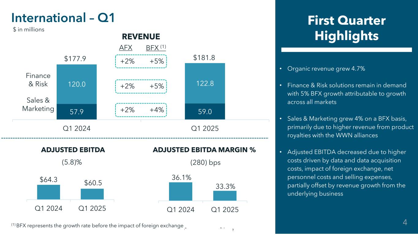Commercial in Confidence 57.9 59.0 120.0 122.8 Q1 2024 Q1 2025 +2% +5% +2% +5% +2% +4% • Organic revenue grew 4.7% • Finance & Risk solutions remain in demand with 5% BFX growth attributable to growth across all markets • Sales & Marketing grew 4% on a BFX basis, primarily due to higher revenue from product royalties with the WWN alliances • Adjusted EBITDA decreased due to higher costs driven by data and data acquisition costs, impact of foreign exchange, net personnel costs and selling expenses, partially offset by revenue growth from the underlying business International – Q1 First Quarter Highlights Finance & Risk Sales & Marketing $177.9 $181.8 AFX BFX (1) $ in millions REVENUE ADJUSTED EBITDA ADJUSTED EBITDA MARGIN % $64.3 $60.5 Q1 2024 Q1 2025 36.1% 33.3% Q1 2024 Q1 2025 (5.8)% (280) bps (1) BFX represents the growth rate before the impact of foreign exchange 4