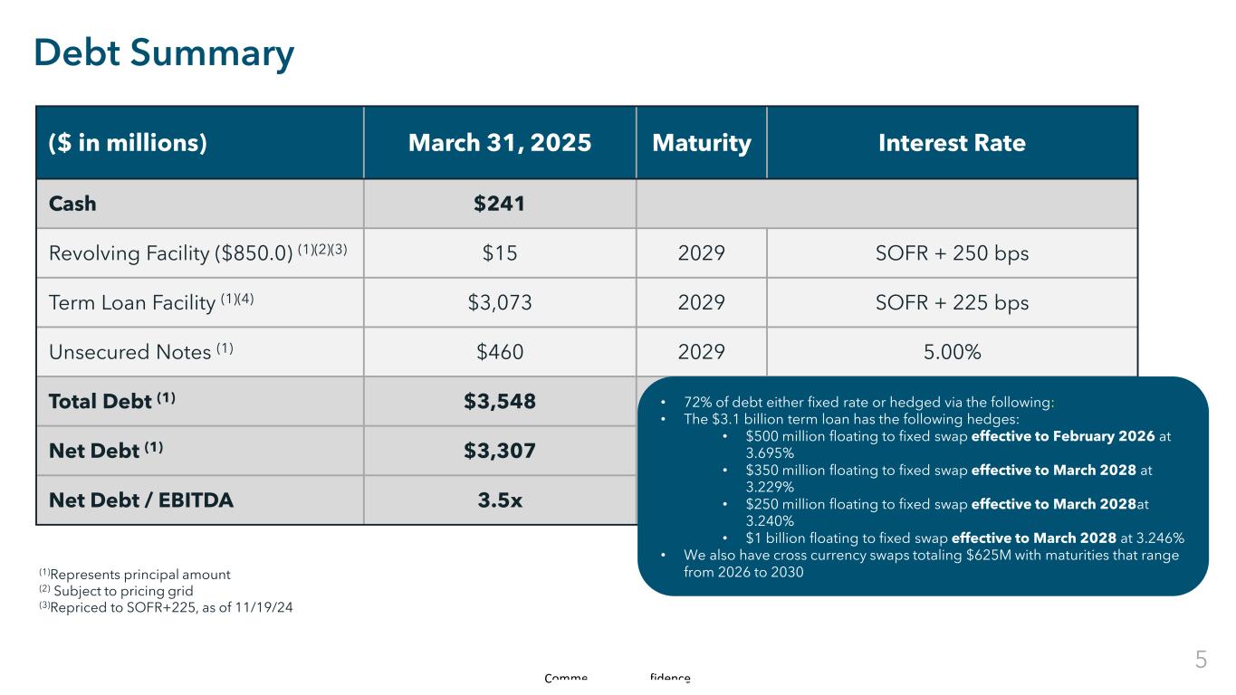Commercial in Confidence Debt Summary ($ in millions) March 31, 2025 Maturity Interest Rate Cash $241 Revolving Facility ($850.0) (1)(2)(3) $15 2029 SOFR + 250 bps Term Loan Facility (1)(4) $3,073 2029 SOFR + 225 bps Unsecured Notes (1) $460 2029 5.00% Total Debt (1) $3,548 Net Debt (1) $3,307 Net Debt / EBITDA 3.5x (1)Represents principal amount (2) Subject to pricing grid (3)Repriced to SOFR+225, as of 11/19/24 • 72% of debt either fixed rate or hedged via the following: • The $3.1 billion term loan has the following hedges: • $500 million floating to fixed swap effective to February 2026 at 3.695% • $350 million floating to fixed swap effective to March 2028 at 3.229% • $250 million floating to fixed swap effective to March 2028at 3.240% • $1 billion floating to fixed swap effective to March 2028 at 3.246% • We also have cross currency swaps totaling $625M with maturities that range from 2026 to 2030 5