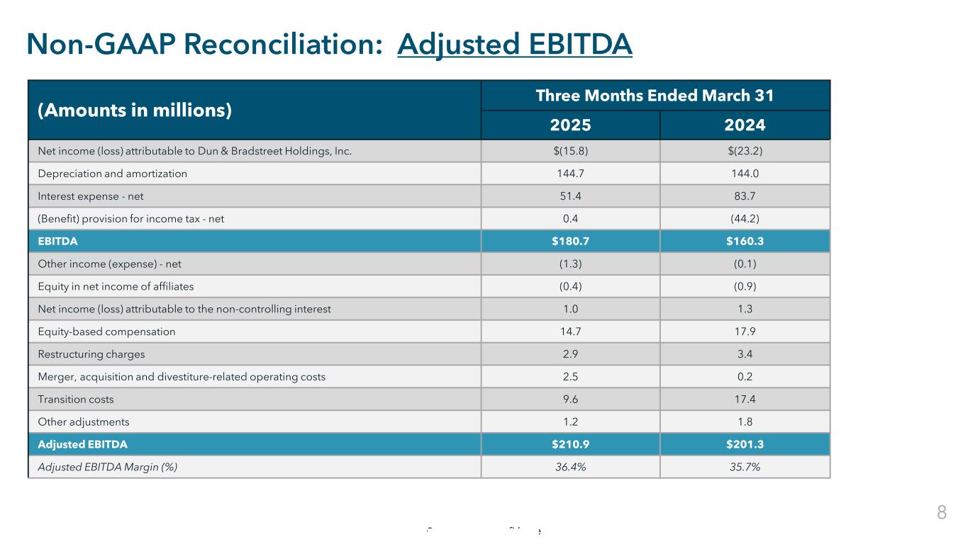 Commercial in Confidence Non-GAAP Reconciliation: Adjusted EBITDA (Amounts in millions) Three Months Ended March 31 2025 2024 Net income (loss) attributable to Dun & Bradstreet Holdings, Inc. $(15.8) $(23.2) Depreciation and amortization 144.7 144.0 Interest expense - net 51.4 83.7 (Benefit) provision for income tax - net 0.4 (44.2) EBITDA $180.7 $160.3 Other income (expense) - net (1.3) (0.1) Equity in net income of affiliates (0.4) (0.9) Net income (loss) attributable to the non-controlling interest 1.0 1.3 Equity-based compensation 14.7 17.9 Restructuring charges 2.9 3.4 Merger, acquisition and divestiture-related operating costs 2.5 0.2 Transition costs 9.6 17.4 Other adjustments 1.2 1.8 Adjusted EBITDA $210.9 $201.3 Adjusted EBITDA Margin (%) 36.4% 35.7% 8