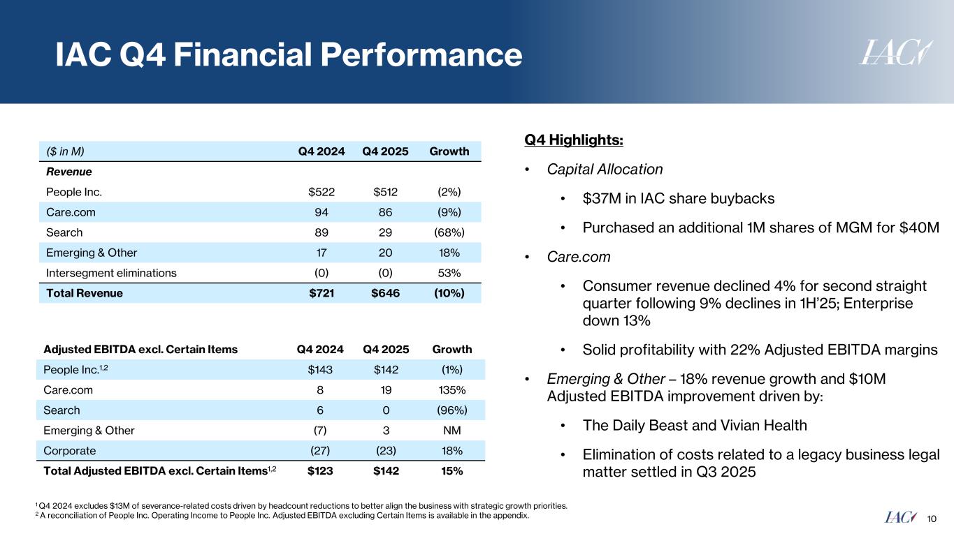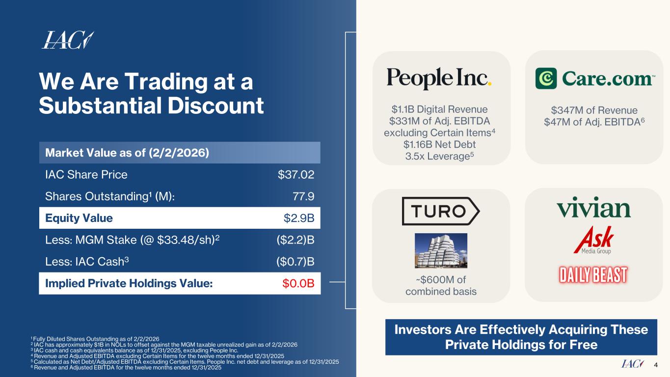 Our Game Plan: Continued Progress 3 • Market leader with multiple growth drivers • IAC owns 65.8M shares $337M of IAC buybacks since the beginning of 2025, including $37M since Q3 Earnings2 10% of IAC equity repurchased since beginning of 2025 $40M purchase of 1M shares of MGM in Q4 A streamlined and focused IAC with People Inc. and MGM stake as the core assets M&A Core Business Execution CatalystsCapital Allocation • Industry-leading digital publisher • 14% Digital revenue growth in Q4’25 • $331M FY’25 Adjusted EBITDA excluding Certain Items1 Corporate cost rationalization 1 Excludes approximately $41 million of net gains from amendments of a lease to surrender certain office space early in Q1 2025 and Q3 2025 and $15 million in severance-related costs in Q3 2025. 2As of 2/2/2026 Angi spin-off in 2025; IAC’s 10th fully independent company Strategic Divestitures Spins