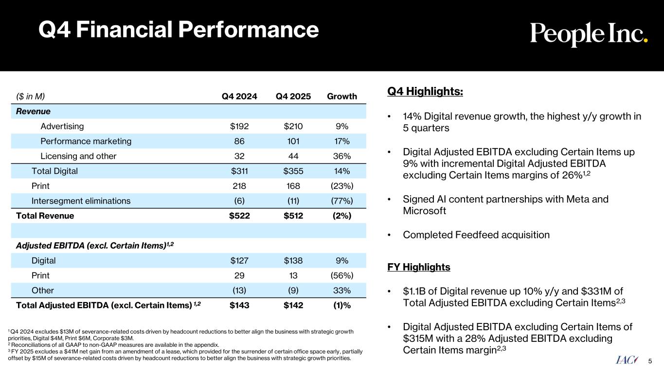 4 We Are Trading at a Substantial Discount Market Value as of (2/2/2026) IAC Share Price $37.02 Shares Outstanding¹ (M): 77.9 Equity Value $2.9B Less: MGM Stake (@ $33.48/sh)2 ($2.2)B Less: IAC Cash3 ($0.7)B Implied Private Holdings Value: $0.0B 1 Fully Diluted Shares Outstanding as of 2/2/2026 2 IAC has approximately $1B in NOLs to offset against the MGM taxable unrealized gain as of 2/2/2026 3 IAC cash and cash equivalents balance as of 12/31/2025, excluding People Inc. 4 Revenue and Adjusted EBITDA excluding Certain Items for the twelve months ended 12/31/2025 5 Calculated as Net Debt/Adjusted EBITDA excluding Certain Items. People Inc. net debt and leverage as of 12/31/2025 6 Revenue and Adjusted EBITDA for the twelve months ended 12/31/2025 $1.1B Digital Revenue $331M of Adj. EBITDA excluding Certain Items4 $1.16B Net Debt 3.5x Leverage5 $347M of Revenue $47M of Adj. EBITDA6 ~$600M of combined basis Investors Are Effectively Acquiring These Private Holdings for Free