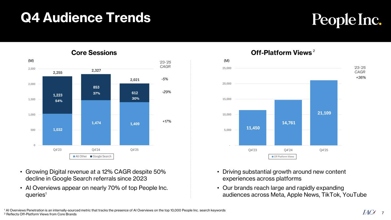 $115 $127 $138 $0 $20 $40 $60 $80 $100 $120 $140 Q4'23 Q4'24 Q4'25 $284 $311 $355 $0 $50 $100 $150 $200 $250 $300 $350 Q4'23 Q4'24 Q4'25 Digital continues to deliver results in Q4 6 Q4 Digital Adj EBITDA excl. Certain Items1,2 Q4 Digital Revenue 9%12% ’23-’25 CAGR’23-’25 CAGR ($M) ($M) $315M for FY’25, 14% 2YR CAGR $1,108M for FY’25, 11% 2YR CAGR 1 Excludes Q4 2024: $4M of severance-related costs driven by headcount reductions to better align the business with strategic growth priorities. 2 A reconciliation of People Inc. Digital Operating Income to People Inc. Digital Adjusted EBITDA excluding Certain Items is available in the appendix. “The Intern” Sexiest Man Alive Nine consecutive quarters of Digital revenue growth and 12% 2YR CAGR Events $116