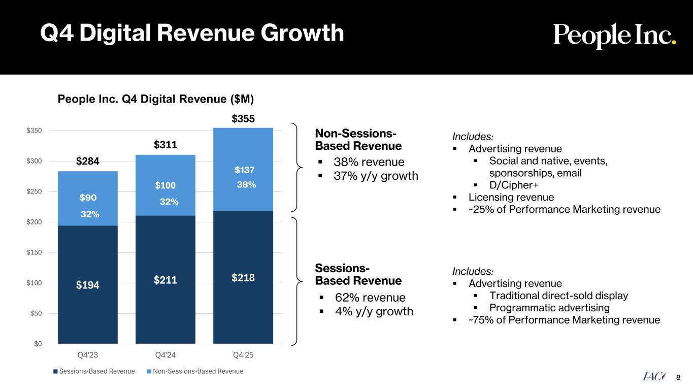1,032 1,474 1,409 1,223 853 612 2,255 2,327 2,021 0 500 1,000 1,500 2,000 2,500 Q4'23 Q4'24 Q4'25 All Other Google Search • Growing Digital revenue at a 12% CAGR despite 50% decline in Google Search referrals since 2023 • AI Overviews appear on nearly 70% of top People Inc. queries 11,450 14,761 21,109 - 5,000 10,000 15,000 20,000 25,000 Q4'23 Q4'24 Q4'25 Off Platform Views +17% (M) -29% -5% ‘23-’25 CAGR Q4 Audience Trends 7 Core Sessions Off-Platform Views +36% ‘23-’25 CAGR 1 (M) • Driving substantial growth around new content experiences across platforms • Our brands reach large and rapidly expanding audiences across Meta, Apple News, TikTok, YouTube 54% 37% 1 AI Overviews Penetration is an internally-sourced metric that tracks the presence of AI Overviews on the top 10,000 People Inc. search keywords 2 Reflects Off-Platform Views from Core Brands 2 30% 54% 37%