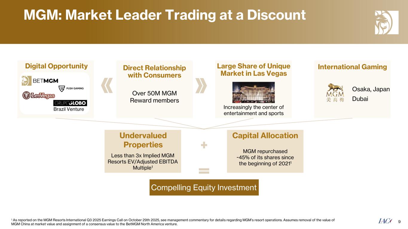 MGM: Market Leader Trading at a Discount 9 Compelling Equity Investment Increasingly the center of entertainment and sports Digital Opportunity Large Share of Unique Market in Las Vegas Less than 3x Implied MGM Resorts EV/Adjusted EBITDA Multiple1 Undervalued Properties Over 50M MGM Reward members Direct Relationship with Consumers Brazil Venture Capital Allocation MGM repurchased ~45% of its shares since the beginning of 20211 International Gaming Osaka, Japan Dubai 1 As reported on the MGM Resorts International Q3 2025 Earnings Call on October 29th 2025, see management commentary for details regarding MGM’s resort operations. Assumes removal of the value of MGM China at market value and assignment of a consensus value to the BetMGM North America venture.