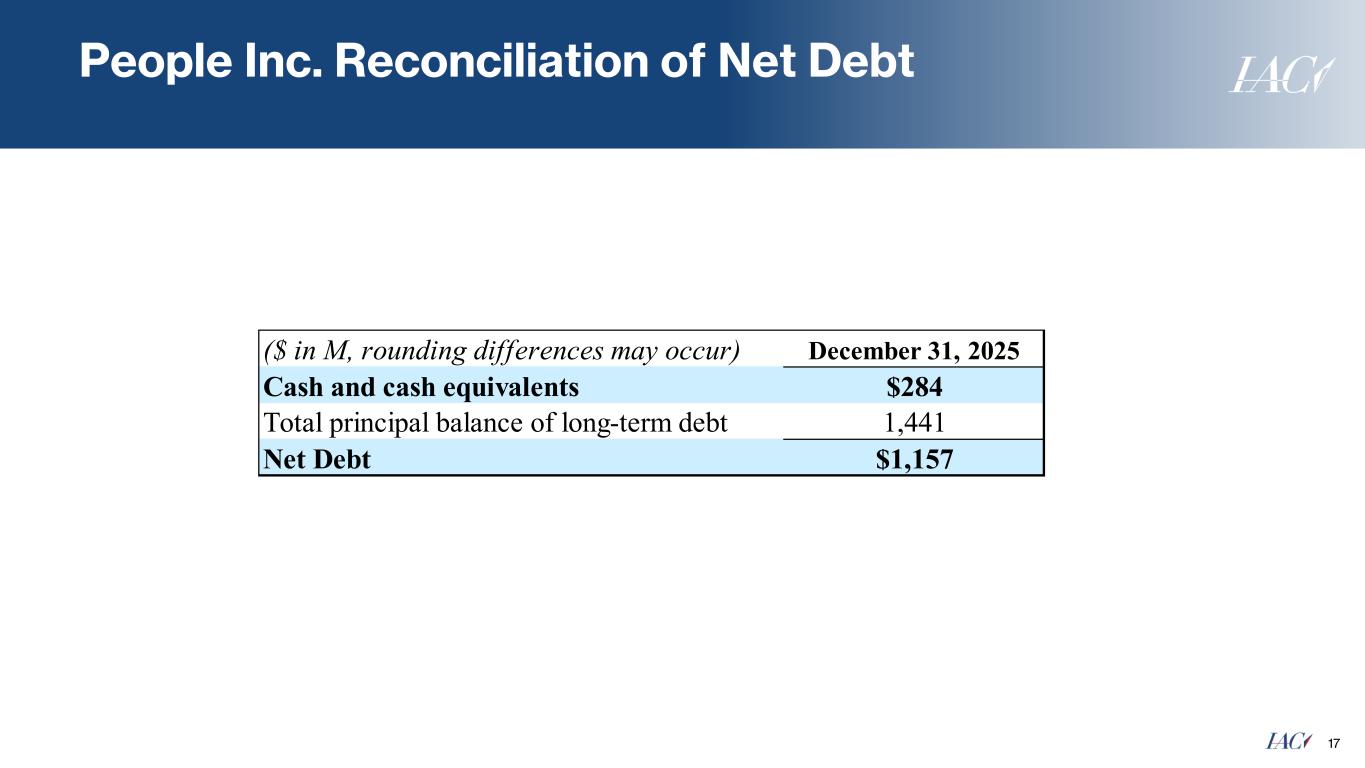 People Inc. reconciliation of FY Digital Operating Income margin to Adjusted EBITDA excl. Certain Items margin 16 1 Consists of approximately $8 million in severance-related costs in Q3 2025. Twelve Months Ended December 31, 2025 ($ in M, rounding differences may occur) Digital Revenue $1,108 Digital Operating Income 207 Digital Operating Income margin 19% Certain Items 8 Digital Operating Income excluding Certain Items $215 Digital Operating Income margin excluding Certain Items 19% Stock-based compensation expense 12 Depreciation 15 Amortization of intangibles 75 Digital Adjusted EBITDA excluding Certain Items $315 Digtal Adjusted EBITDA excluding Certain Items margin 28% 1