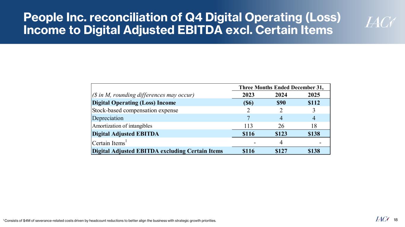 People Inc. reconciliation of Q4 Digital Operating (Loss) Income to Digital Adjusted EBITDA excl. Certain Items 181 Consists of $4M of severance-related costs driven by headcount reductions to better align the business with strategic growth priorities. Three Months Ended December 31, ($ in M, rounding differences may occur) 2023 2024 2025 Digital Operating (Loss) Income ($6) $90 $112 Stock-based compensation expense 2 2 3 Depreciation 7 4 4 Amortization of intangibles 113 26 18 Digital Adjusted EBITDA $116 $123 $138 Certain Items 1 - 4 - Digital Adjusted EBITDA excluding Certain Items $116 $127 $138