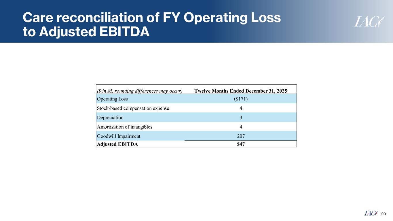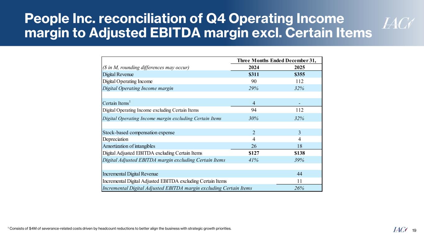 People Inc. reconciliation of Q4 Operating Income margin to Adjusted EBITDA margin excl. Certain Items 19 Three Months Ended December 31, ($ in M, rounding differences may occur) 2024 2025 Digital Revenue $311 $355 Digital Operating Income 90 112 Digital Operating Income margin 29% 32% Certain Items 1 4 - Digital Operating Income excluding Certain Items 94 112 Digital Operating Income margin excluding Certain Items 30% 32% Stock-based compensation expense 2 3 Depreciation 4 4 Amortization of intangibles 26 18 Digital Adjusted EBITDA excluding Certain Items $127 $138 Digital Adjusted EBITDA margin excluding Certain Items 41% 39% Incremental Digital Revenue 44 Incremental Digital Adjusted EBITDA excluding Certain Items 11 Incremental Digital Adjusted EBITDA margin excluding Certain Items 26% 1 Consists of $4M of severance-related costs driven by headcount reductions to better align the business with strategic growth priorities.