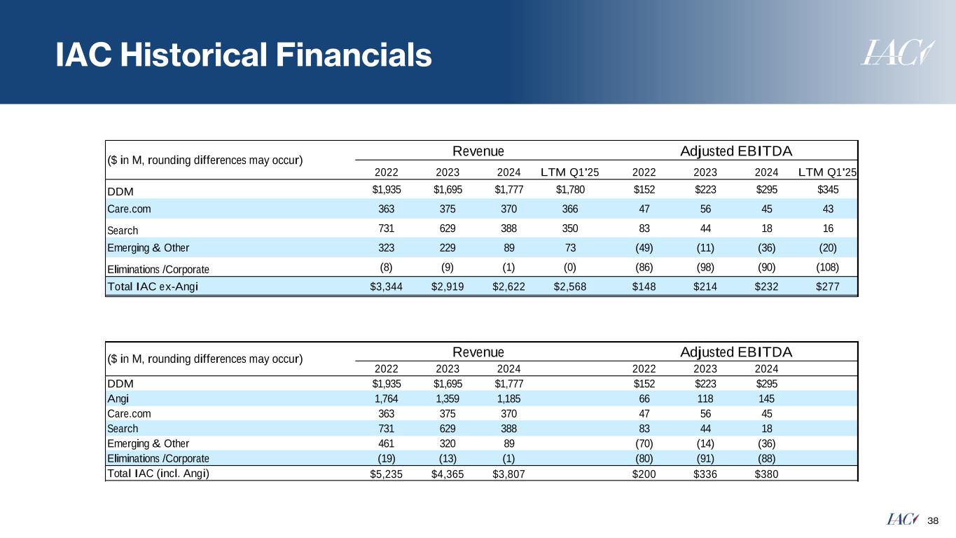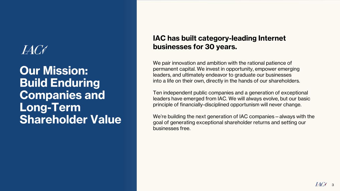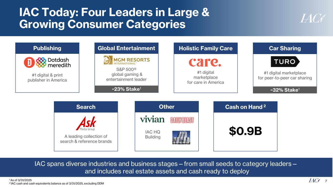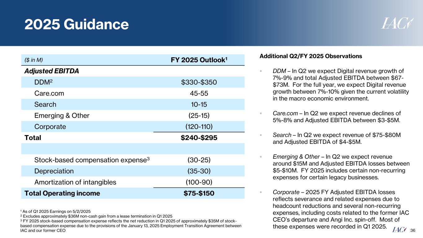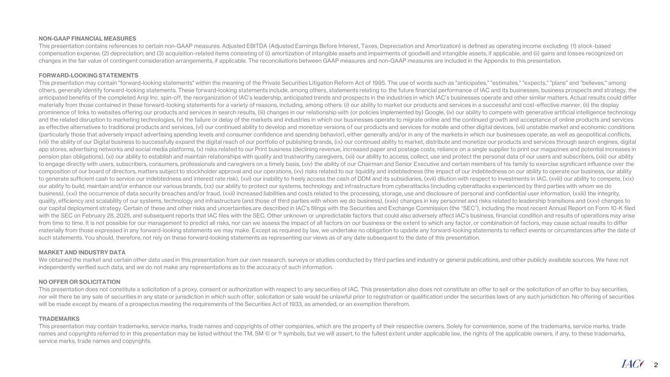 NON-GAAP FINANCIAL MEASURES This presentation contains references to certain non-GAAP measures. Adjusted EBITDA (Adjusted Earnings Before Interest, Taxes, Depreciation and Amortization) is defined as operating income excluding: (1) stock-based compensation expense; (2) depreciation; and (3) acquisition-related items consisting of (i) amortization of intangible assets and impairments of goodwill and intangible assets, if applicable, and (ii) gains and losses recognized on changes in the fair value of contingent consideration arrangements, if applicable. The reconciliations between GAAP measures and non-GAAP measures are included in the Appendix to this presentation. FORWARD-LOOKING STATEMENTS This presentation may contain "forward-looking statements" within the meaning of the Private Securities Litigation Reform Act of 1995. The use of words such as "anticipates," "estimates," "expects," "plans" and "believes," among others, generally identify forward-looking statements. These forward-looking statements include, among others, statements relating to: the future financial performance of IAC and its businesses, business prospects and strategy, the anticipated benefits of the completed Angi Inc. spin-off, the reorganization of IAC’s leadership, anticipated trends and prospects in the industries in which IAC’s businesses operate and other similar matters. Actual results could differ materially from those contained in these forward-looking statements for a variety of reasons, including, among others: (i) our ability to market our products and services in a successful and cost-effective manner, (ii) the display prominence of links to websites offering our products and services in search results, (iii) changes in our relationship with (or policies implemented by) Google, (iv) our ability to compete with generative artificial intelligence technology and the related disruption to marketing technologies, (v) the failure or delay of the markets and industries in which our businesses operate to migrate online and the continued growth and acceptance of online products and services as effective alternatives to traditional products and services, (vi) our continued ability to develop and monetize versions of our products and services for mobile and other digital devices, (vii) unstable market and economic conditions (particularly those that adversely impact advertising spending levels and consumer confidence and spending behavior), either generally and/or in any of the markets in which our businesses operate, as well as geopolitical conflicts, (viii) the ability of our Digital business to successfully expand the digital reach of our portfolio of publishing brands, (ix) our continued ability to market, distribute and monetize our products and services through search engines, digital app stores, advertising networks and social media platforms, (x) risks related to our Print business (declining revenue, increased paper and postage costs, reliance on a single supplier to print our magazines and potential increases in pension plan obligations), (xi) our ability to establish and maintain relationships with quality and trustworthy caregivers, (xii) our ability to access, collect, use and protect the personal data of our users and subscribers, (xiii) our ability to engage directly with users, subscribers, consumers, professionals and caregivers on a timely basis, (xiv) the ability of our Chairman and Senior Executive and certain members of his family to exercise significant influence over the composition of our board of directors, matters subject to stockholder approval and our operations, (xv) risks related to our liquidity and indebtedness (the impact of our indebtedness on our ability to operate our business, our ability to generate sufficient cash to service our indebtedness and interest rate risk), (xvi) our inability to freely access the cash of DDM and its subsidiaries, (xvii) dilution with respect to investments in IAC, (xviii) our ability to compete, (xix) our ability to build, maintain and/or enhance our various brands, (xx) our ability to protect our systems, technology and infrastructure from cyberattacks (including cyberattacks experienced by third parties with whom we do business), (xxi) the occurrence of data security breaches and/or fraud, (xxii) increased liabilities and costs related to the processing, storage, use and disclosure of personal and confidential user information, (xxiii) the integrity, quality, efficiency and scalability of our systems, technology and infrastructure (and those of third parties with whom we do business), (xxiv) changes in key personnel and risks related to leadership transitions and (xxv) changes to our capital deployment strategy. Certain of these and other risks and uncertainties are described in IAC’s filings with the Securities and Exchange Commission (the “SEC”), including the most recent Annual Report on Form 10-K filed with the SEC on February 28, 2025, and subsequent reports that IAC files with the SEC. Other unknown or unpredictable factors that could also adversely affect IAC's business, financial condition and results of operations may arise from time to time. It is not possible for our management to predict all risks, nor can we assess the impact of all factors on our business or the extent to which any factor, or combination of factors, may cause actual results to differ materially from those expressed in any forward-looking statements we may make. Except as required by law, we undertake no obligation to update any forward-looking statements to reflect events or circumstances after the date of such statements. You should, therefore, not rely on these forward-looking statements as representing our views as of any date subsequent to the date of this presentation. MARKET AND INDUSTRY DATA We obtained the market and certain other data used in this presentation from our own research, surveys or studies conducted by third parties and industry or gene