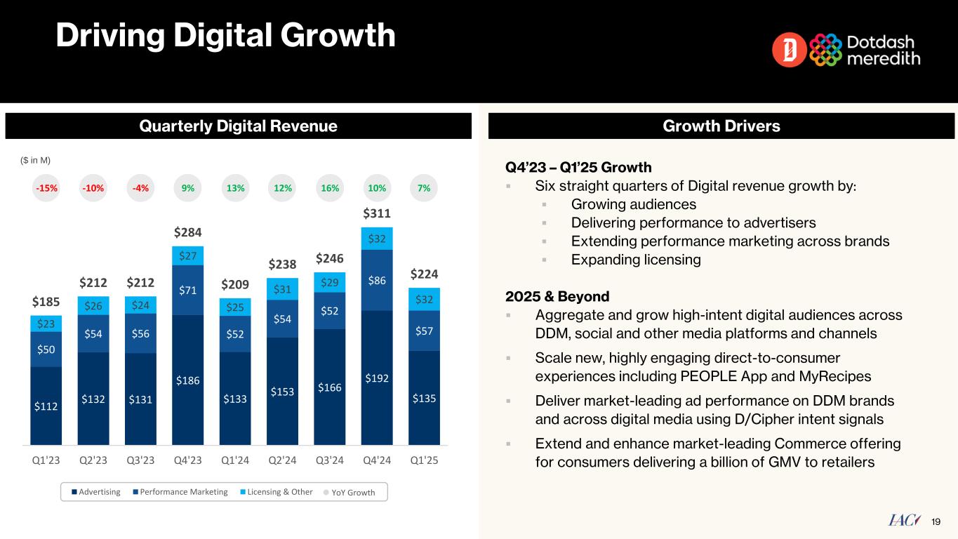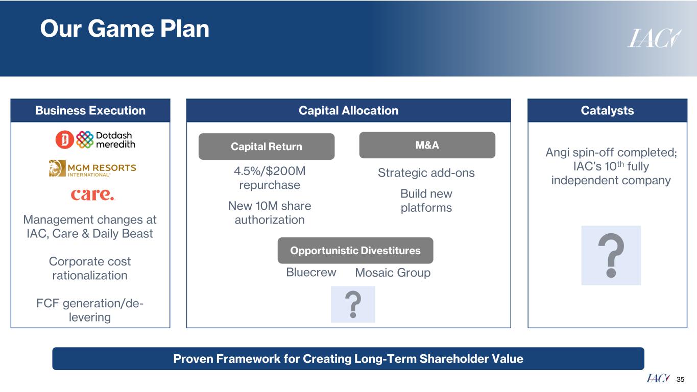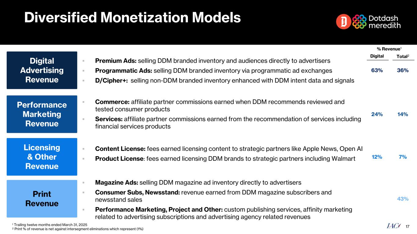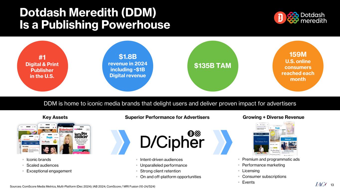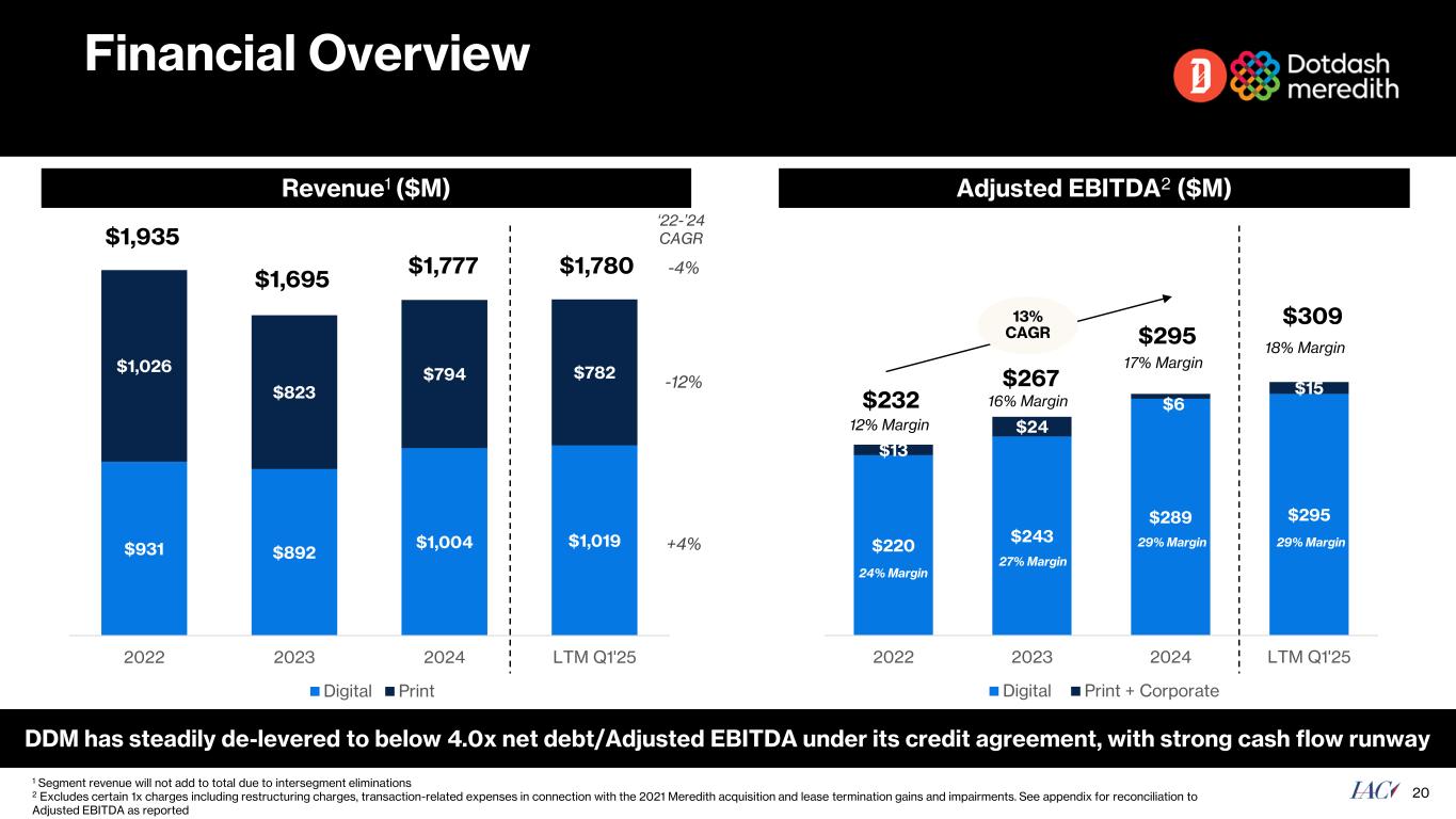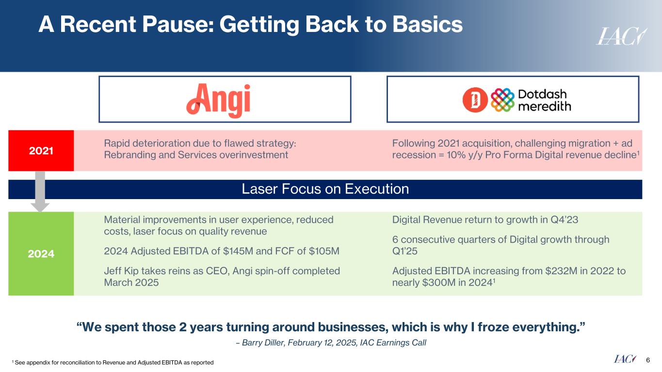 NON-GAAP FINANCIAL MEASURES This presentation contains references to certain non-GAAP measures. Adjusted EBITDA (Adjusted Earnings Before Interest, Taxes, Depreciation and Amortization) is defined as operating income excluding: (1) stock-based compensation expense; (2) depreciation; and (3) acquisition-related items consisting of (i) amortization of intangible assets and impairments of goodwill and intangible assets, if applicable, and (ii) gains and losses recognized on changes in the fair value of contingent consideration arrangements, if applicable. The reconciliations between GAAP measures and non-GAAP measures are included in the Appendix to this presentation. FORWARD-LOOKING STATEMENTS This presentation may contain "forward-looking statements" within the meaning of the Private Securities Litigation Reform Act of 1995. The use of words such as "anticipates," "estimates," "expects," "plans" and "believes," among others, generally identify forward-looking statements. These forward-looking statements include, among others, statements relating to: the future financial performance of IAC and its businesses, business prospects and strategy, the anticipated benefits of the completed Angi Inc. spin-off, the reorganization of IAC’s leadership, anticipated trends and prospects in the industries in which IAC’s businesses operate and other similar matters. Actual results could differ materially from those contained in these forward-looking statements for a variety of reasons, including, among others: (i) our ability to market our products and services in a successful and cost-effective manner, (ii) the display prominence of links to websites offering our products and services in search results, (iii) changes in our relationship with (or policies implemented by) Google, (iv) our ability to compete with generative artificial intelligence technology and the related disruption to marketing technologies, (v) the failure or delay of the markets and industries in which our businesses operate to migrate online and the continued growth and acceptance of online products and services as effective alternatives to traditional products and services, (vi) our continued ability to develop and monetize versions of our products and services for mobile and other digital devices, (vii) unstable market and economic conditions (particularly those that adversely impact advertising spending levels and consumer confidence and spending behavior), either generally and/or in any of the markets in which our businesses operate, as well as geopolitical conflicts, (viii) the ability of our Digital business to successfully expand the digital reach of our portfolio of publishing brands, (ix) our continued ability to market, distribute and monetize our products and services through search engines, digital app stores, advertising networks and social media platforms, (x) risks related to our Print business (declining revenue, increased paper and postage costs, reliance on a single supplier to print our magazines and potential increases in pension plan obligations), (xi) our ability to establish and maintain relationships with quality and trustworthy caregivers, (xii) our ability to access, collect, use and protect the personal data of our users and subscribers, (xiii) our ability to engage directly with users, subscribers, consumers, professionals and caregivers on a timely basis, (xiv) the ability of our Chairman and Senior Executive and certain members of his family to exercise significant influence over the composition of our board of directors, matters subject to stockholder approval and our operations, (xv) risks related to our liquidity and indebtedness (the impact of our indebtedness on our ability to operate our business, our ability to generate sufficient cash to service our indebtedness and interest rate risk), (xvi) our inability to freely access the cash of DDM and its subsidiaries, (xvii) dilution with respect to investments in IAC, (xviii) our ability to compete, (xix) our ability to build, maintain and/or enhance our various brands, (xx) our ability to protect our systems, technology and infrastructure from cyberattacks (including cyberattacks experienced by third parties with whom we do business), (xxi) the occurrence of data security breaches and/or fraud, (xxii) increased liabilities and costs related to the processing, storage, use and disclosure of personal and confidential user information, (xxiii) the integrity, quality, efficiency and scalability of our systems, technology and infrastructure (and those of third parties with whom we do business), (xxiv) changes in key personnel and risks related to leadership transitions and (xxv) changes to our capital deployment strategy. Certain of these and other risks and uncertainties are described in IAC’s filings with the Securities and Exchange Commission (the “SEC”), including the most recent Annual Report on Form 10-K filed with the SEC on February 28, 2025, and subsequent reports that IAC files with the SEC. Other unknown or unpredictable factors that could also adversely affect IAC's business, financial condition and results of operations may arise from time to time. It is not possible for our management to predict all risks, nor can we assess the impact of all factors on our business or the extent to which any factor, or combination of factors, may cause actual results to differ materially from those expressed in any forward-looking statements we may make. Except as required by law, we undertake no obligation to update any forward-looking statements to reflect events or circumstances after the date of such statements. You should, therefore, not rely on these forward-looking statements as representing our views as of any date subsequent to the date of this presentation. MARKET AND INDUSTRY DATA We obtained the market and certain other data used in this presentation from our own research, surveys or studies conducted by third parties and industry or gene