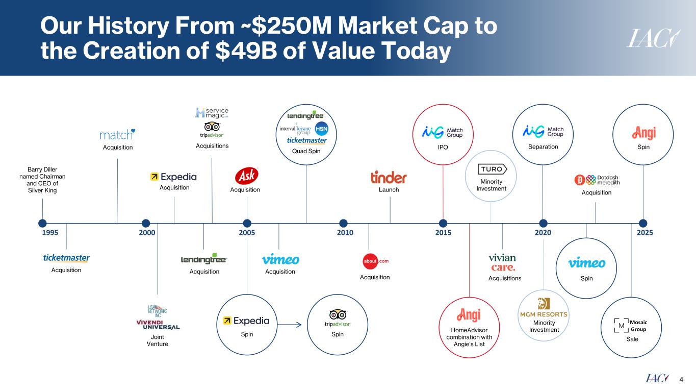 3 Our Mission: Build Enduring Companies and Long-Term Shareholder Value We pair innovation and ambition with the rational patience of permanent capital. We invest in opportunity, empower emerging leaders, and ultimately endeavor to graduate our businesses into a life on their own, directly in the hands of our shareholders. Ten independent public companies and a generation of exceptional leaders have emerged from IAC. We will always evolve, but our basic principle of financially-disciplined opportunism will never change. We’re building the next generation of IAC companies—always with the goal of generating exceptional shareholder returns and setting our businesses free. IAC has built category-leading Internet businesses for 30 years.
