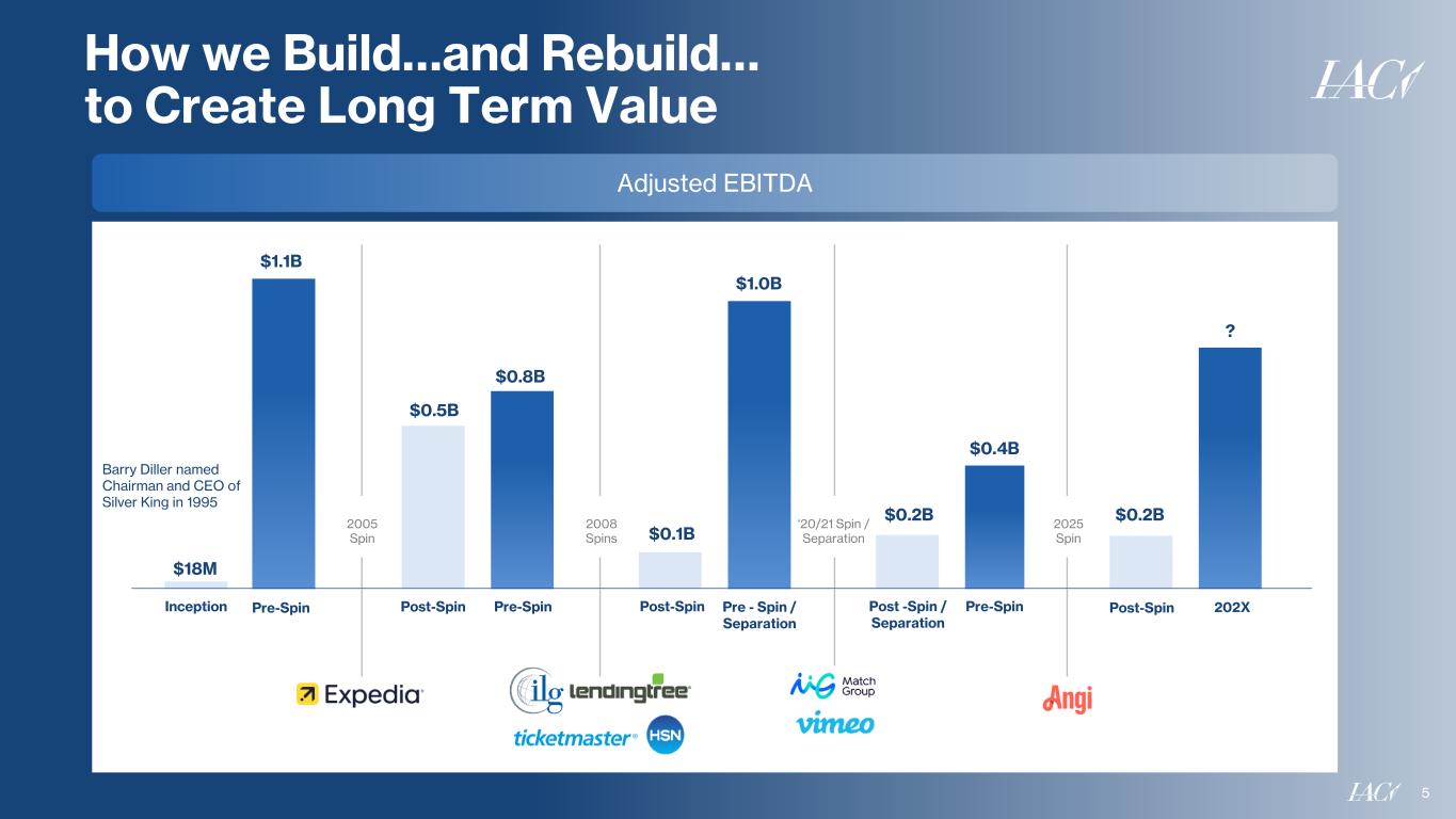 Our History From ~$250M Market Cap to the Creation of $49B of Value Today 4 1995 2000 2005 2010 2015 2020 2025 Acquisition Acquisition Joint Venture Acquisition Acquisition Acquisitions Acquisition Acquisition Acquisition Launch Minority Investment Acquisitions Minority Investment Acquisition Mosaic Group Spin Spin Quad Spin IPO HomeAdvisor combination with Angie’s List Separation Spin Sale Barry Diller named Chairman and CEO of Silver King Spin