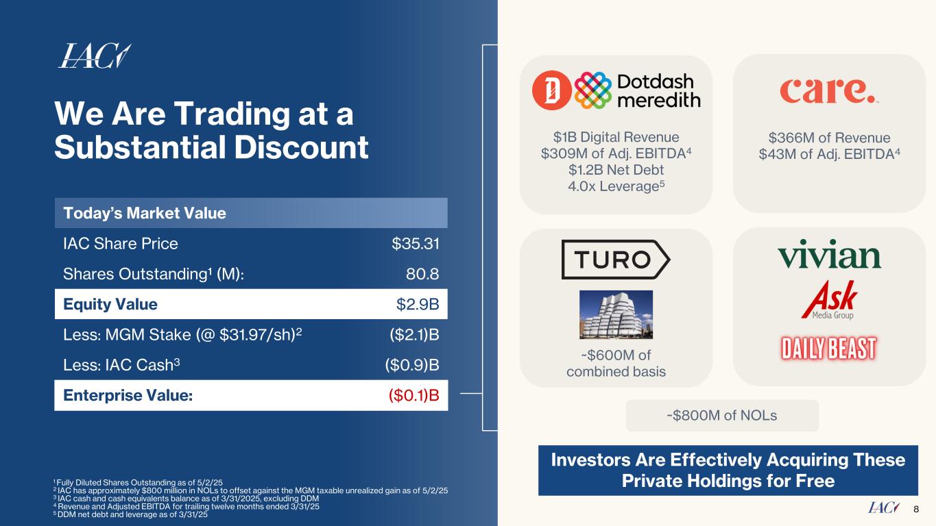 IAC Today: Four Leaders in Large & Growing Consumer Categories 7 IAC spans diverse industries and business stages—from small seeds to category leaders— and includes real estate assets and cash ready to deploy Cash on Hand 2 $0.9B Publishing #1 digital & print publisher in America Global Entertainment #1 digital marketplace for care in America Holistic Family Care ~23% Stake1 S&P 500® global gaming & entertainment leader Car Sharing ~32% Stake1 #1 digital marketplace for peer-to-peer car sharing Search A leading collection of search & reference brands Other IAC HQ Building 1 As of 3/31/2025 2 IAC cash and cash equivalents balance as of 3/31/2025, excluding DDM