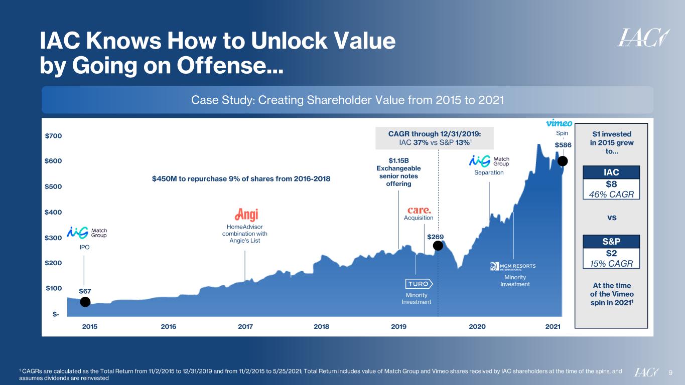 8 We Are Trading at a Substantial Discount Today’s Market Value IAC Share Price $35.31 Shares Outstanding¹ (M): 80.8 Equity Value $2.9B Less: MGM Stake (@ $31.97/sh)2 ($2.1)B Less: IAC Cash3 ($0.9)B Enterprise Value: ($0.1)B 1 Fully Diluted Shares Outstanding as of 5/2/25 2 IAC has approximately $800 million in NOLs to offset against the MGM taxable unrealized gain as of 5/2/25 3 IAC cash and cash equivalents balance as of 3/31/2025, excluding DDM 4 Revenue and Adjusted EBITDA for trailing twelve months ended 3/31/25 5 DDM net debt and leverage as of 3/31/25 $1B Digital Revenue $309M of Adj. EBITDA4 $1.2B Net Debt 4.0x Leverage5 $366M of Revenue $43M of Adj. EBITDA4 ~$600M of combined basis Investors Are Effectively Acquiring These Private Holdings for Free ~$800M of NOLs