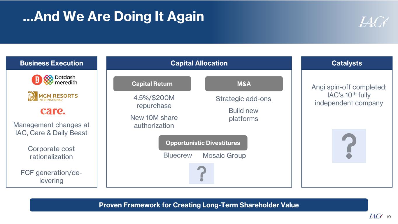 Spin 9 IAC Knows How to Unlock Value by Going on Offense... Case Study: Creating Shareholder Value from 2015 to 2021 2015 2016 2017 2018 2019 2020 2021 1 CAGRs are calculated as the Total Return from 11/2/2015 to 12/31/2019 and from 11/2/2015 to 5/25/2021; Total Return includes value of Match Group and Vimeo shares received by IAC shareholders at the time of the spins, and assumes dividends are reinvested CAGR through 12/31/2019: IAC 37% vs S&P 13%1 $269 $67 Minority Investment Minority Investment $450M to repurchase 9% of shares from 2016-2018 $1.15B Exchangeable senior notes offering HomeAdvisor combination with Angie’s List IPO Acquisition Separation $- $100 $200 $300 $400 $500 $600 $700 $586 $1 invested in 2015 grew to… $8 46% CAGR IAC vs $2 15% CAGR S&P At the time of the Vimeo spin in 20211