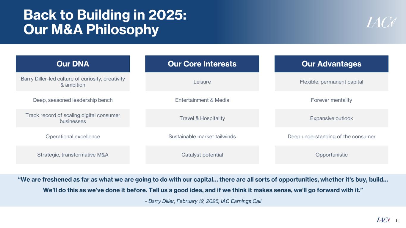 …And We Are Doing It Again 10 Management changes at IAC, Care & Daily Beast Corporate cost rationalization FCF generation/de- levering Strategic add-ons Build new platforms Capital Return 4.5%/$200M repurchase New 10M share authorization Opportunistic Divestitures Bluecrew Angi spin-off completed; IAC’s 10th fully independent company Proven Framework for Creating Long-Term Shareholder Value M&A Mosaic Group Business Execution CatalystsCapital Allocation