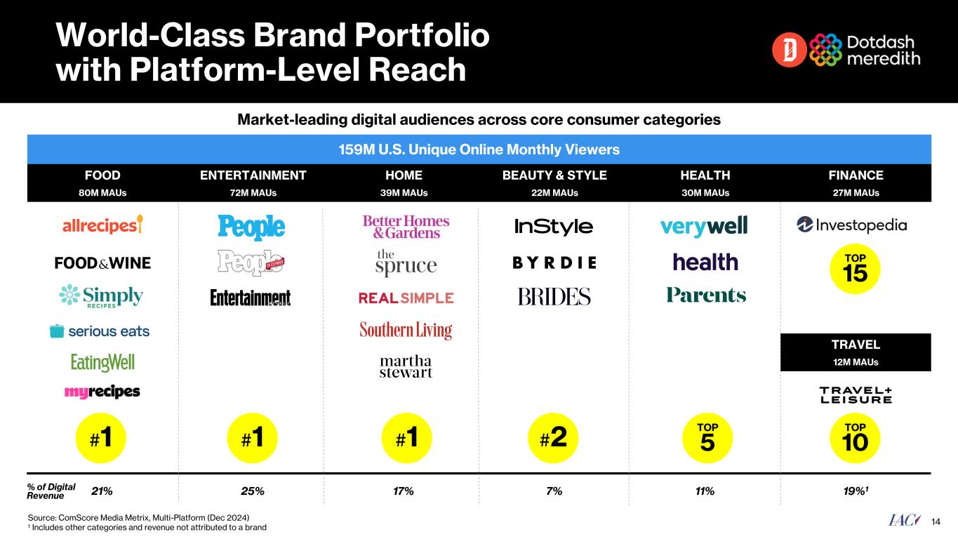 Dotdash Meredith (DDM) Is a Publishing Powerhouse 13 $1.8B revenue in 2024 including ~$1B Digital revenue $135B TAM 159M U.S. online consumers reached each month #1 Digital & Print Publisher in the U.S. ▪ Intent-driven audiences ▪ Unparalleled performance ▪ Strong client retention ▪ On and off-platform opportunities Key Assets Superior Performance for Advertisers Growing + Diverse Revenue Sources: ComScore Media Metrics, Multi-Platform (Dec 2024); IAB 2024; ComScore / MRI Fusion (10-24/S24) ▪ Premium and programmatic ads ▪ Performance marketing ▪ Licensing ▪ Consumer subscriptions ▪ Events ▪ Iconic brands ▪ Scaled audiences ▪ Exceptional engagement DDM is home to iconic media brands that delight users and deliver proven impact for advertisers