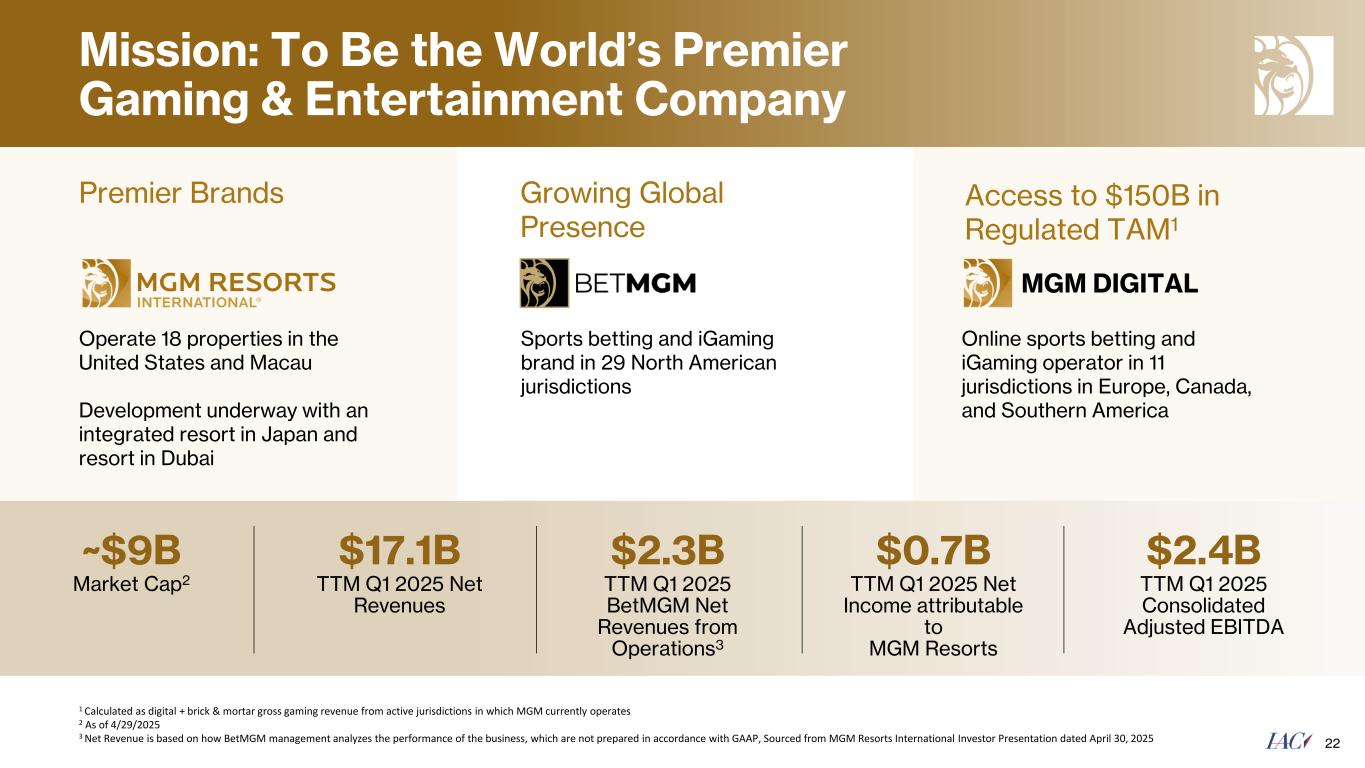 Operate 18 properties in the United States and Macau Development underway with an integrated resort in Japan and resort in Dubai Sports betting and iGaming brand in 29 North American jurisdictions Online sports betting and iGaming operator in 11 jurisdictions in Europe, Canada, and Southern America Premier Brands Growing Global Presence Access to $150B in Regulated TAM1 MGM DIGITAL 1 Calculated as digital + brick & mortar gross gaming revenue from active jurisdictions in which MGM currently operates 2 As of 4/29/2025 3 Net Revenue is based on how BetMGM management analyzes the performance of the business, which are not prepared in accordance with GAAP, Sourced from MGM Resorts International Investor Presentation dated April 30, 2025 ~$9B Market Cap2 $17.1B TTM Q1 2025 Net Revenues $2.3B TTM Q1 2025 BetMGM Net Revenues from Operations3 $0.7B TTM Q1 2025 Net Income attributable to MGM Resorts $2.4B TTM Q1 2025 Consolidated Adjusted EBITDA Mission: To Be the World’s Premier Gaming & Entertainment Company 22