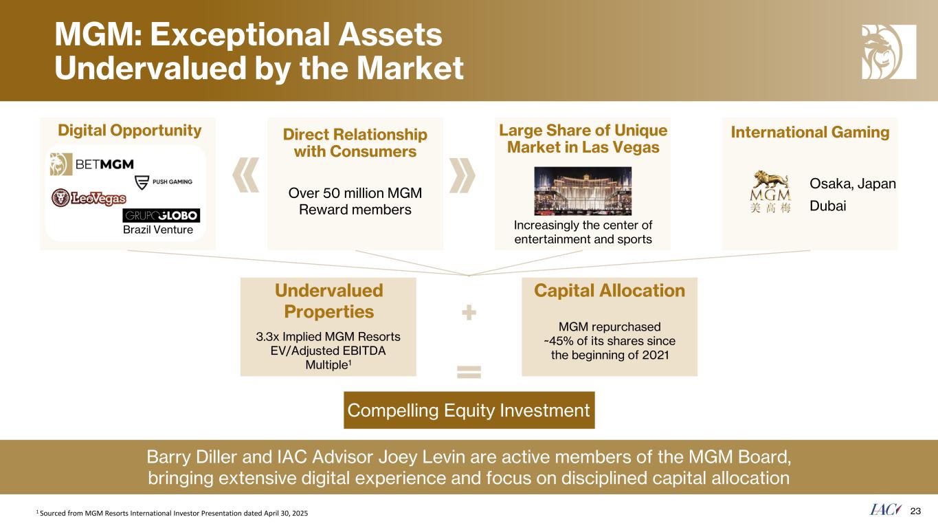 MGM: Exceptional Assets Undervalued by the Market 23 Barry Diller and IAC Advisor Joey Levin are active members of the MGM Board, bringing extensive digital experience and focus on disciplined capital allocation Compelling Equity Investment Increasingly the center of entertainment and sports Digital Opportunity Large Share of Unique Market in Las Vegas 3.3x Implied MGM Resorts EV/Adjusted EBITDA Multiple1 Undervalued Properties Over 50 million MGM Reward members Direct Relationship with Consumers Brazil Venture Capital Allocation MGM repurchased ~45% of its shares since the beginning of 2021 International Gaming Osaka, Japan Dubai 1 Sourced from MGM Resorts International Investor Presentation dated April 30, 2025