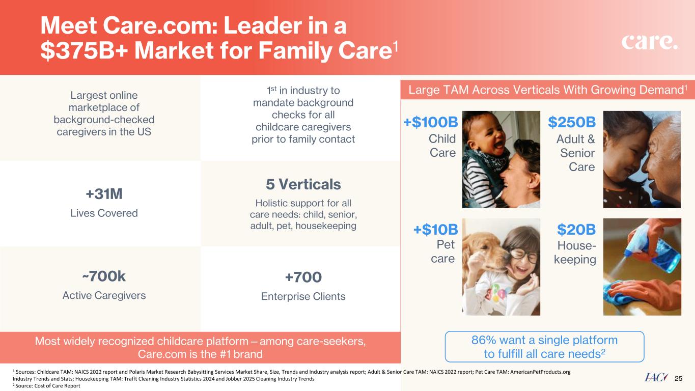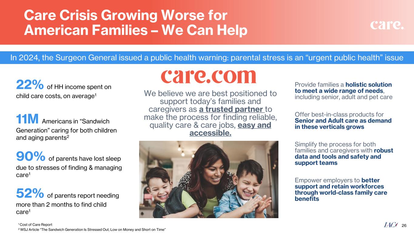 Meet Care.com: Leader in a $375B+ Market for Family Care1 +31M Lives Covered ~700k Active Caregivers +700 Enterprise Clients 5 Verticals Holistic support for all care needs: child, senior, adult, pet, housekeeping Largest online marketplace of background-checked caregivers in the US 1st in industry to mandate background checks for all childcare caregivers prior to family contact +$100B $250B +$10B $20B Large TAM Across Verticals With Growing Demand1 25 86% want a single platform to fulfill all care needs2 Most widely recognized childcare platform—among care-seekers, Care.com is the #1 brand Child Care Pet care Adult & Senior Care House- keeping 1 Sources: Childcare TAM: NAICS 2022 report and Polaris Market Research Babysitting Services Market Share, Size, Trends and Industry analysis report; Adult & Senior Care TAM: NAICS 2022 report; Pet Care TAM: AmericanPetProducts.org Industry Trends and Stats; Housekeeping TAM: Trafft Cleaning Industry Statistics 2024 and Jobber 2025 Cleaning Industry Trends 2 Source: Cost of Care Report