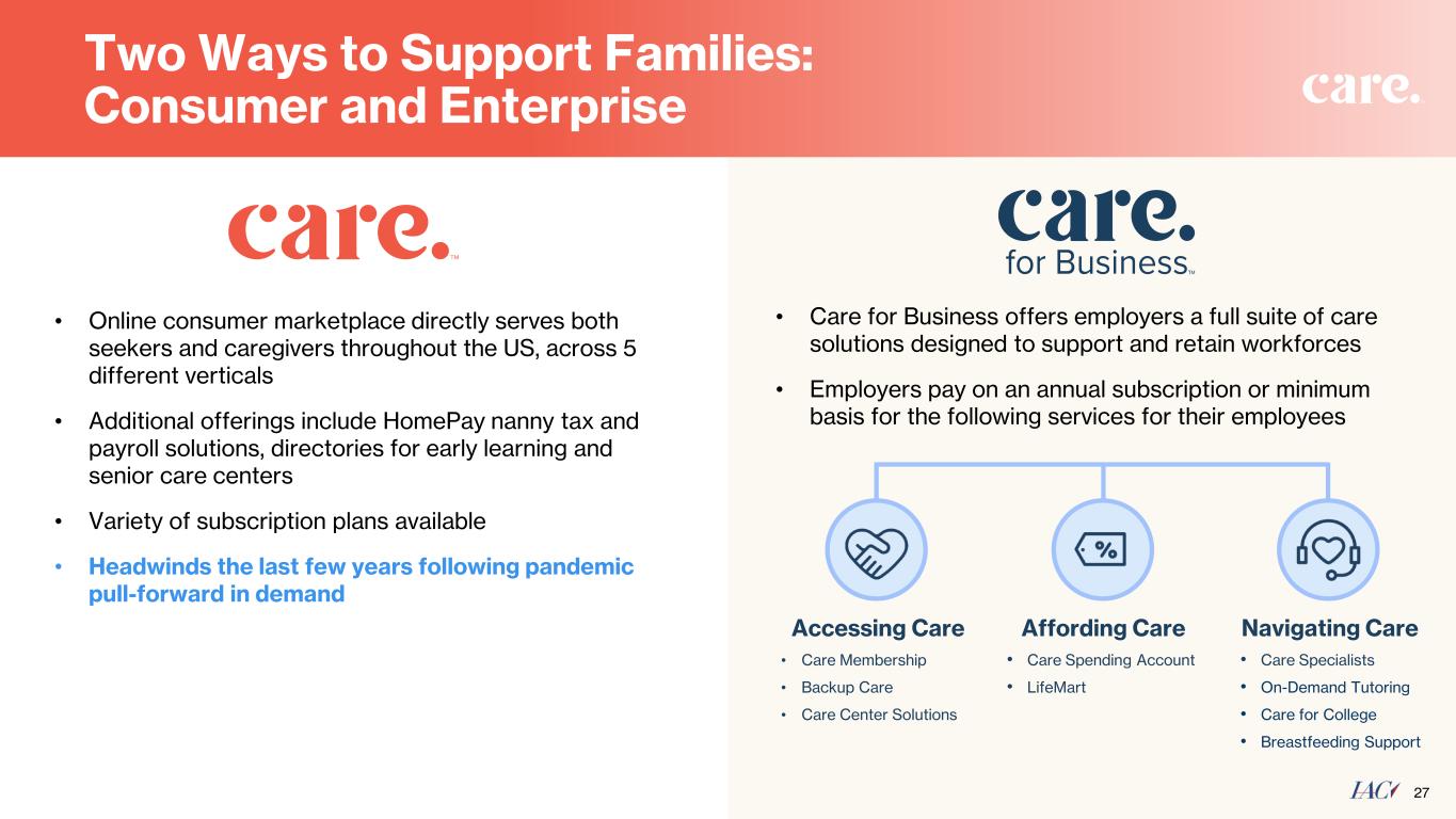 Care Crisis Growing Worse for American Families – We Can Help 26 22% of HH income spent on child care costs, on average1 90% of parents have lost sleep due to stresses of finding & managing care1 11M Americans in “Sandwich Generation” caring for both children and aging parents2 52% of parents report needing more than 2 months to find child care1 In 2024, the Surgeon General issued a public health warning: parental stress is an “urgent public health” issue We believe we are best positioned to support today’s families and caregivers as a trusted partner to make the process for finding reliable, quality care & care jobs, easy and accessible. Provide families a holistic solution to meet a wide range of needs, including senior, adult and pet care Offer best-in-class products for Senior and Adult care as demand in these verticals grows Simplify the process for both families and caregivers with robust data and tools and safety and support teams Empower employers to better support and retain workforces through world-class family care benefits 1 Cost of Care Report 2 WSJ Article “The Sandwich Generation Is Stressed Out, Low on Money and Short on Time”