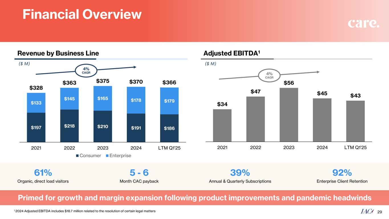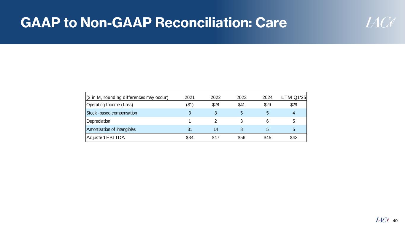 GAAP to Non-GAAP Reconciliation: Care 40 ($ in M, rounding differences may occur) 2021 2022 2023 2024 LTM Q1'25 Operating Income (Loss) ($1) $28 $41 $29 $29 Stock -based compensation 3 3 5 5 4 Depreciation 1 2 3 6 5 Amortization of intangibles 31 14 8 5 5 Adjusted EBITDA $34 $47 $56 $45 $43