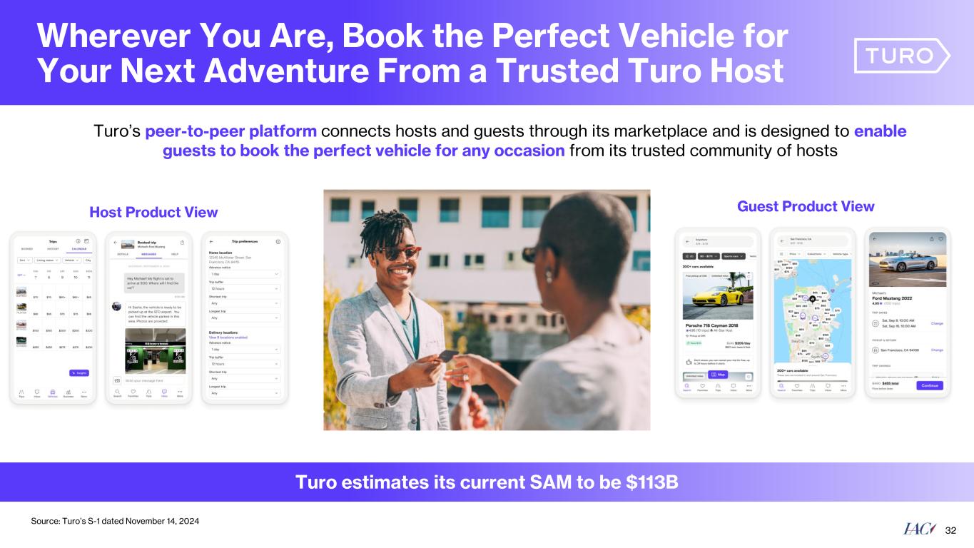 Wherever You Are, Book the Perfect Vehicle for Your Next Adventure From a Trusted Turo Host 32 Turo’s peer-to-peer platform connects hosts and guests through its marketplace and is designed to enable guests to book the perfect vehicle for any occasion from its trusted community of hosts Host Product View Guest Product View Turo estimates its current SAM to be $113B Source: Turo’s S-1 dated November 14, 2024