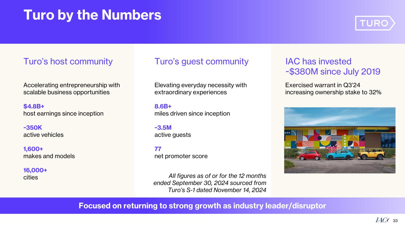 Accelerating entrepreneurship with scalable business opportunities $4.8B+ host earnings since inception ~350K active vehicles 1,600+ makes and models 16,000+ cities Elevating everyday necessity with extraordinary experiences 8.6B+ miles driven since inception ~3.5M active guests 77 net promoter score Exercised warrant in Q3’24 increasing ownership stake to 32% Turo’s host community Turo’s guest community IAC has invested ~$380M since July 2019 Turo by the Numbers 33 All figures as of or for the 12 months ended September 30, 2024 sourced from Turo’s S-1 dated November 14, 2024 Focused on returning to strong growth as industry leader/disruptor