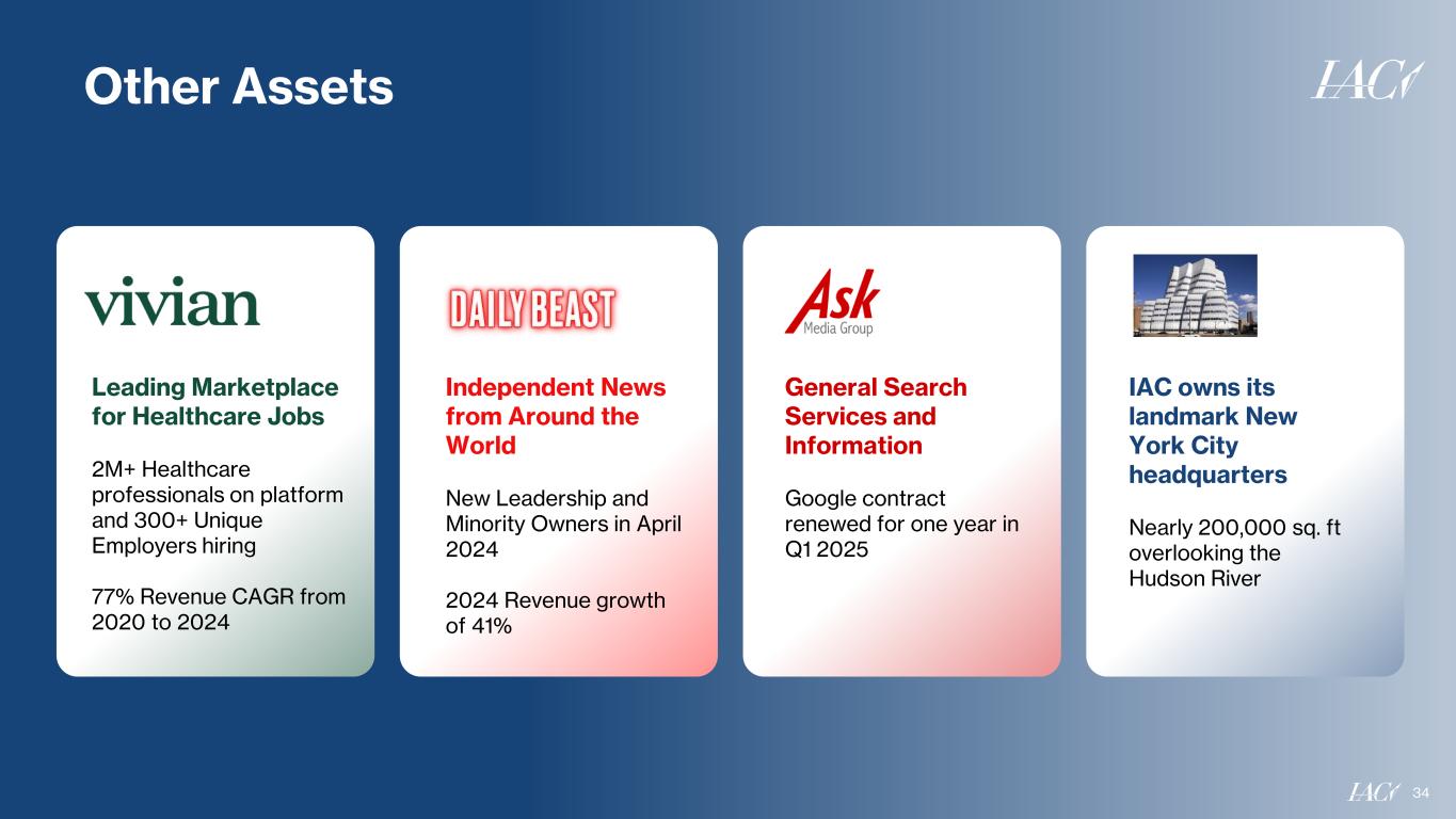 34 Other Assets Leading Marketplace for Healthcare Jobs 2M+ Healthcare professionals on platform and 300+ Unique Employers hiring 77% Revenue CAGR from 2020 to 2024 Independent News from Around the World New Leadership and Minority Owners in April 2024 2024 Revenue growth of 41% General Search Services and Information Google contract renewed for one year in Q1 2025 IAC owns its landmark New York City headquarters Nearly 200,000 sq. ft overlooking the Hudson River