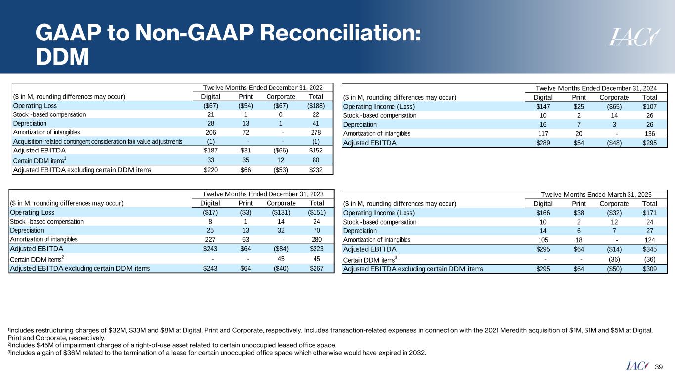GAAP to Non-GAAP Reconciliation: DDM 39 1Includes restructuring charges of $32M, $33M and $8M at Digital, Print and Corporate, respectively. Includes transaction-related expenses in connection with the 2021 Meredith acquisition of $1M, $1M and $5M at Digital, Print and Corporate, respectively. 2Includes $45M of impairment charges of a right-of-use asset related to certain unoccupied leased office space. 3Includes a gain of $36M related to the termination of a lease for certain unoccupied office space which otherwise would have expired in 2032. Twelve Months Ended December 31, 2022 ($ in M, rounding differences may occur) Digital Print Corporate Total Operating Loss ($67) ($54) ($67) ($188) Stock -based compensation 21 1 0 22 Depreciation 28 13 1 41 Amortization of intangibles 206 72 - 278 Acquisition-related contingent consideration fair value adjustments (1) - - (1) Adjusted EBITDA $187 $31 ($66) $152 Certain DDM items 1 33 35 12 80 Adjusted EBITDA excluding certain DDM items $220 $66 ($53) $232 Twelve Months Ended December 31, 2023 ($ in M, rounding differences may occur) Digital Print Corporate Total Operating Loss ($17) ($3) ($131) ($151) Stock -based compensation 8 1 14 24 Depreciation 25 13 32 70 Amortization of intangibles 227 53 - 280 Adjusted EBITDA $243 $64 ($84) $223 Certain DDM items 2 - - 45 45 Adjusted EBITDA excluding certain DDM items $243 $64 ($40) $267 Twelve Months Ended December 31, 2024 ($ in M, rounding differences may occur) Digital Print Corporate Total Operating Income (Loss) $147 $25 ($65) $107 Stock -based compensation 10 2 14 26 Depreciation 16 7 3 26 Amortization of intangibles 117 20 - 136 Adjusted EBITDA $289 $54 ($48) $295 Twelve Months Ended March 31, 2025 ($ in M, rounding differences may occur) Digital Print Corporate Total Operating Income (Loss) $166 $38 ($32) $171 Stock -based compensation 10 2 12 24 Depreciation 14 6 7 27 Amortization of intangibles 105 18 - 124 Adjusted EBITDA $295 $64 ($14) $345 Certain DDM items 3 - - (36) (36) Adjusted EBITDA excluding certain DDM items $295 $64 ($50) $309
