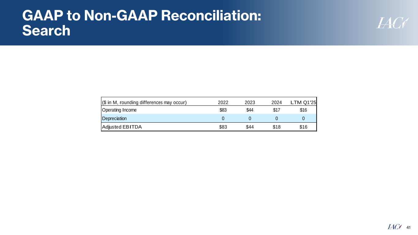 GAAP to Non-GAAP Reconciliation: Search 41 ($ in M, rounding differences may occur) 2022 2023 2024 LTM Q1'25 Operating Income $83 $44 $17 $16 Depreciation 0 0 0 0 Adjusted EBITDA $83 $44 $18 $16