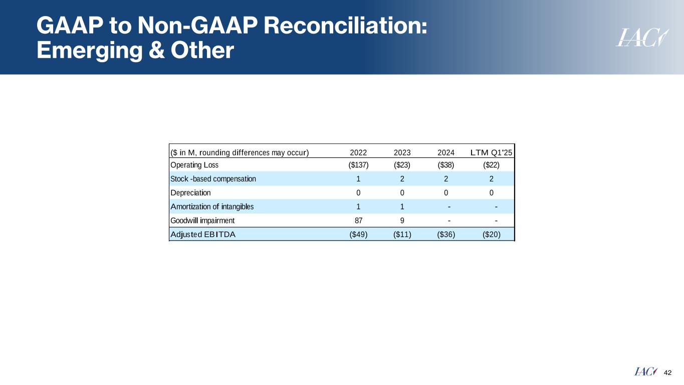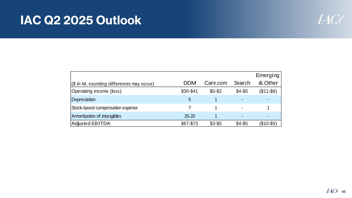 IAC Q2 2025 Outlook 46 Emerging ($ in M, rounding differences may occur) DDM Care.com Search & Other Operating income (loss) $30-$41 $0-$2 $4-$5 ($11-$6) Depreciation 5 1 - - Stock-based compensation expense 7 1 - 1 Amortization of intangibles 25-20 1 - - Adjusted EBITDA $67-$73 $3-$5 $4-$5 ($10-$5)