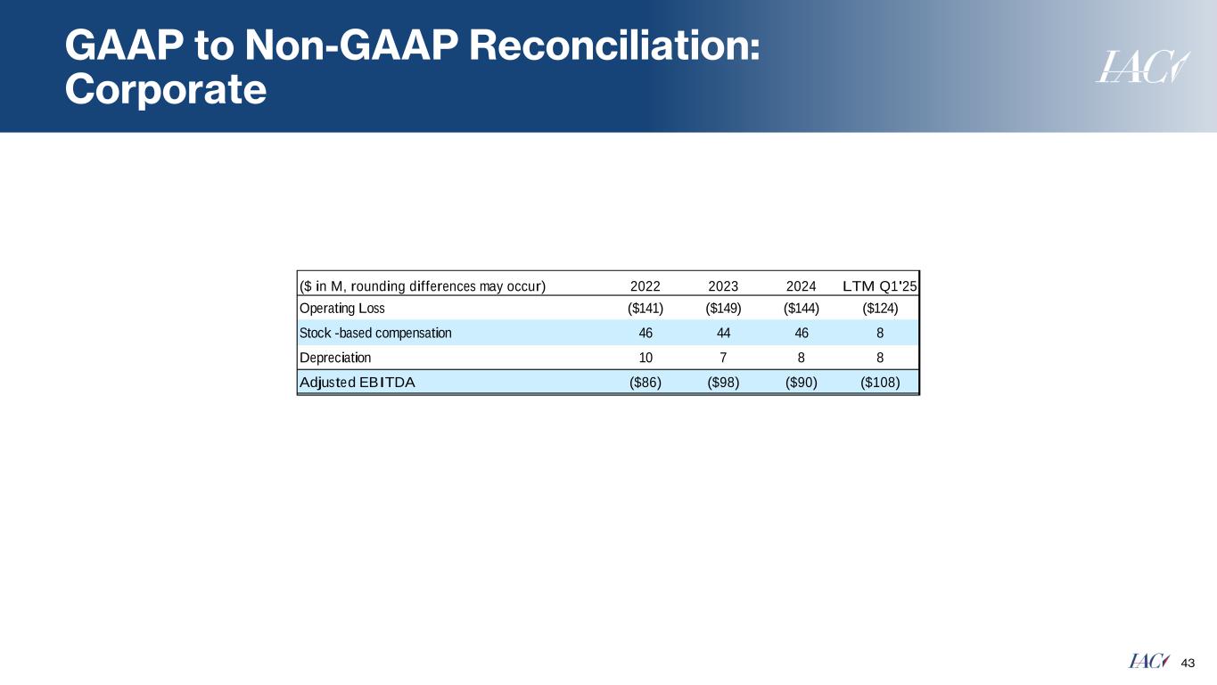 GAAP to Non-GAAP Reconciliation: Emerging & Other 42 ($ in M, rounding differences may occur) 2022 2023 2024 LTM Q1'25 Operating Loss ($137) ($23) ($38) ($22) Stock -based compensation 1 2 2 2 Depreciation 0 0 0 0 Amortization of intangibles 1 1 - - Goodwill impairment 87 9 - - Adjusted EBITDA ($49) ($11) ($36) ($20)