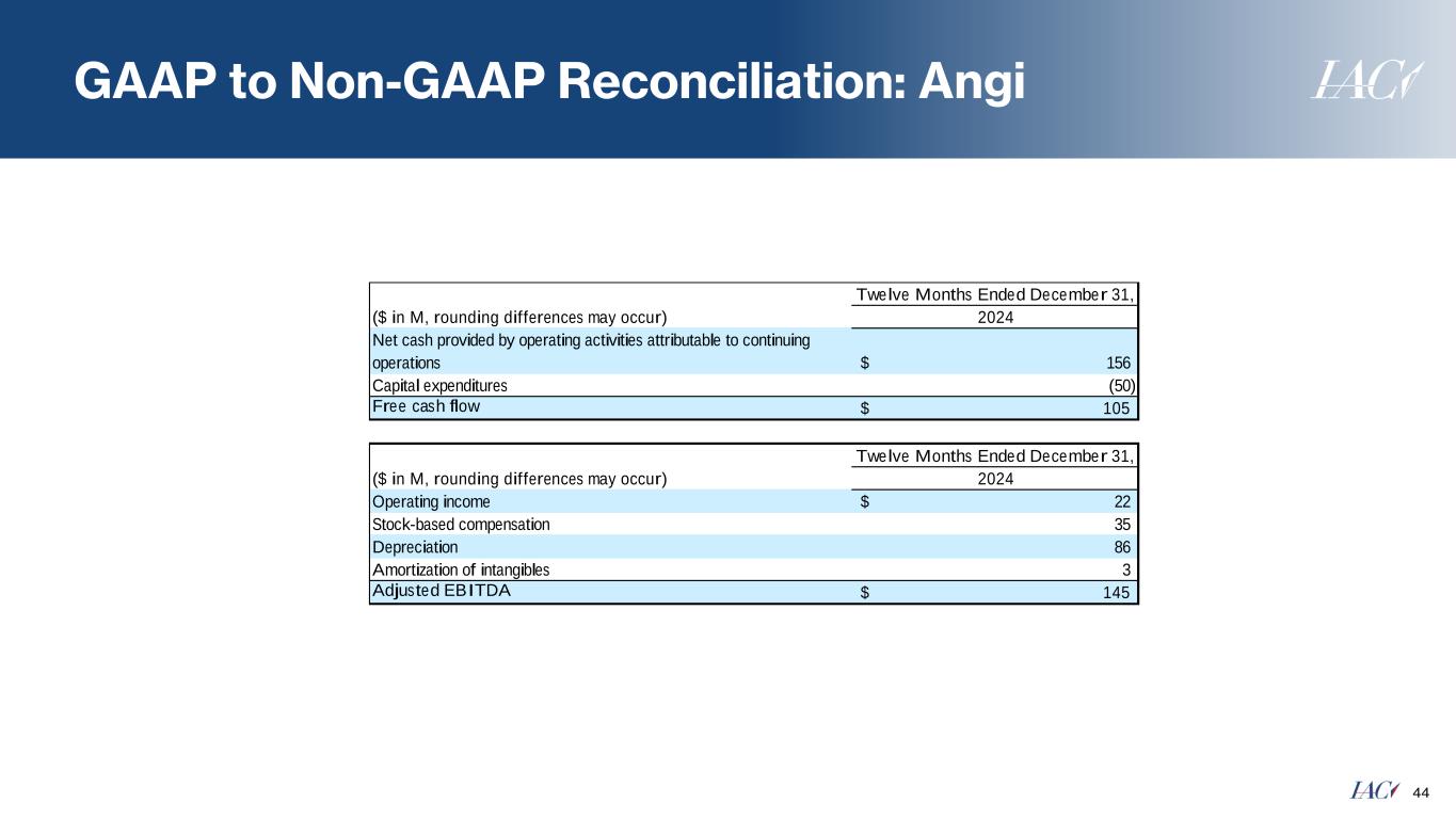 GAAP to Non-GAAP Reconciliation: Angi 44 Twelve Months Ended December 31, ($ in M, rounding differences may occur) 2024 Net cash provided by operating activities attributable to continuing operations 156$ Capital expenditures (50) Free cash flow 105$ Twelve Months Ended December 31, ($ in M, rounding differences may occur) 2024 Operating income 22$ Stock-based compensation 35 Depreciation 86 Amortization of intangibles 3 Adjusted EBITDA 145$