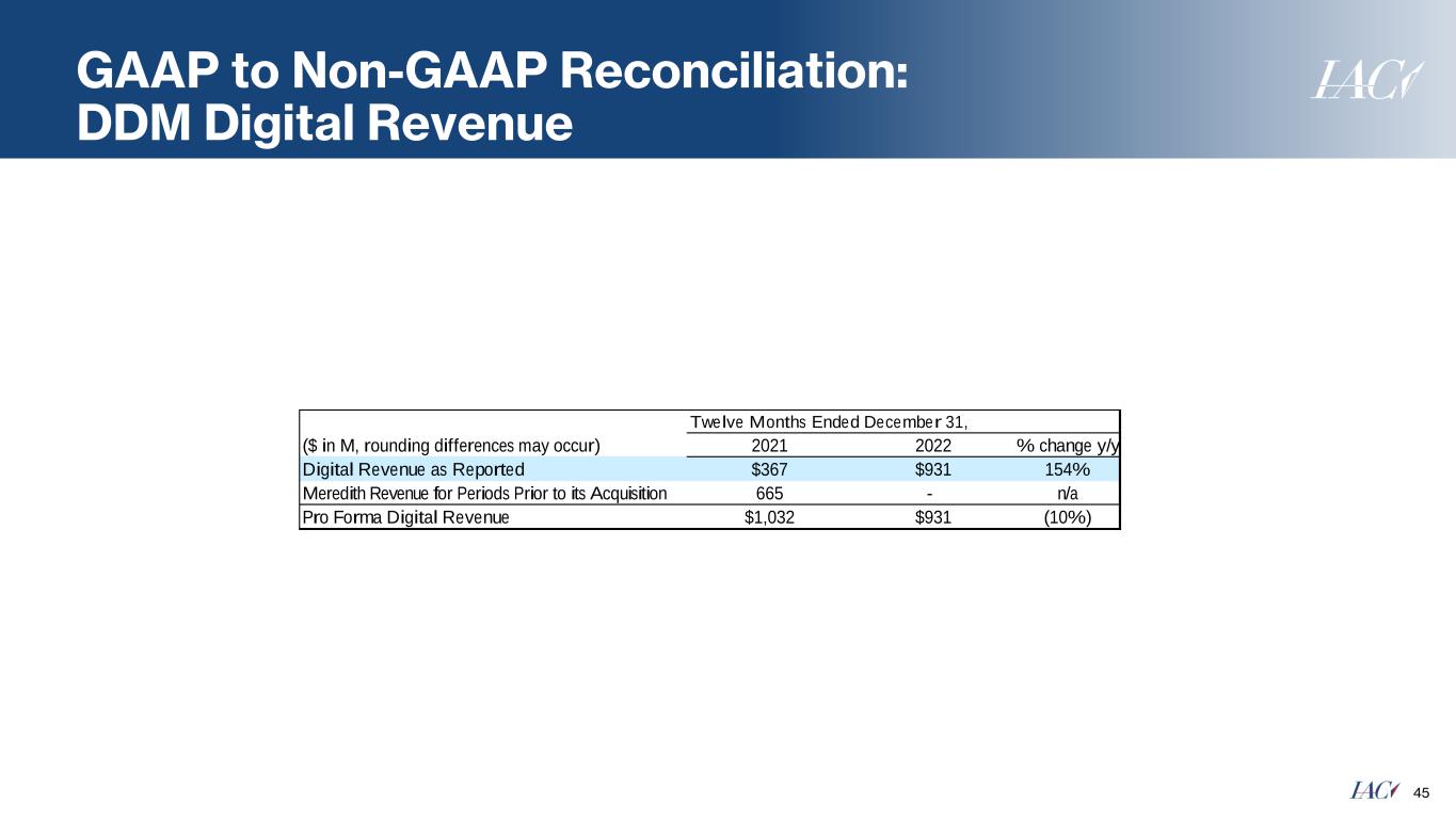 GAAP to Non-GAAP Reconciliation: DDM Digital Revenue 45 Twelve Months Ended December 31, ($ in M, rounding differences may occur) 2021 2022 % change y/y Digital Revenue as Reported $367 $931 154% Meredith Revenue for Periods Prior to its Acquisition 665 - n/a Pro Forma Digital Revenue $1,032 $931 (10%)