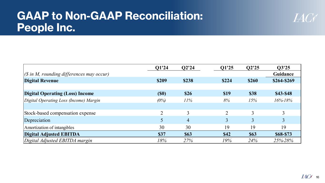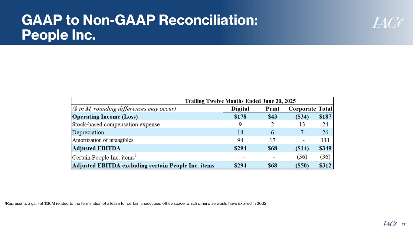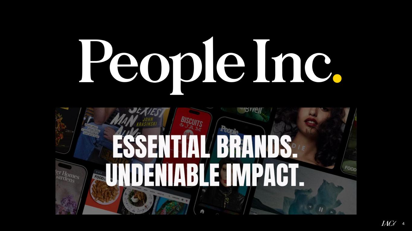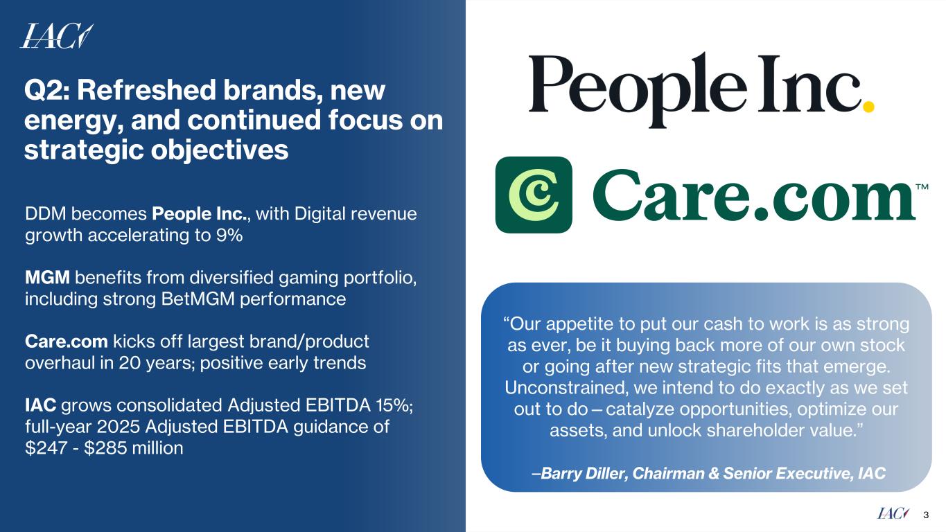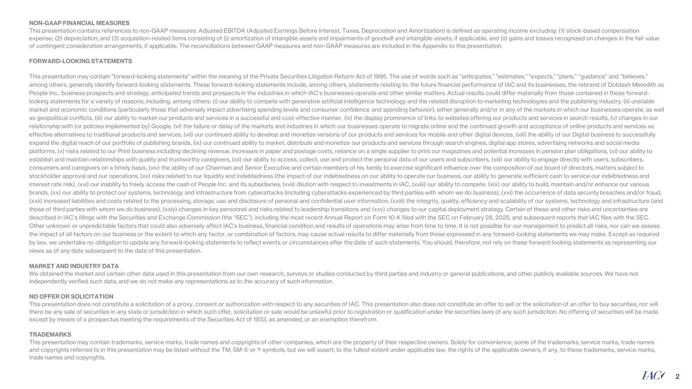 NON-GAAP FINANCIAL MEASURES This presentation contains references to non-GAAP measures. Adjusted EBITDA (Adjusted Earnings Before Interest, Taxes, Depreciation and Amortization) is defined as operating income excluding: (1) stock-based compensation expense; (2) depreciation; and (3) acquisition-related items consisting of (i) amortization of intangible assets and impairments of goodwill and intangible assets, if applicable, and (ii) gains and losses recognized on changes in the fair value of contingent consideration arrangements, if applicable. The reconciliations between GAAP measures and non-GAAP measures are included in the Appendix to this presentation. FORWARD-LOOKING STATEMENTS This presentation may contain "forward-looking statements" within the meaning of the Private Securities Litigation Reform Act of 1995. The use of words such as "anticipates," "estimates," "expects," "plans," “guidance” and "believes," among others, generally identify forward-looking statements. These forward-looking statements include, among others, statements relating to: the future financial performance of IAC and its businesses, the rebrand of Dotdash Meredith as People Inc., business prospects and strategy, anticipated trends and prospects in the industries in which IAC’s businesses operate and other similar matters. Actual results could differ materially from those contained in these forward- looking statements for a variety of reasons, including, among others: (i) our ability to compete with generative artificial intelligence technology and the related disruption to marketing technologies and the publishing industry, (ii) unstable market and economic conditions (particularly those that adversely impact advertising spending levels and consumer confidence and spending behavior), either generally and/or in any of the markets in which our businesses operate, as well as geopolitical conflicts, (iii) our ability to market our products and services in a successful and cost-effective manner, (iv) the display prominence of links to websites offering our products and services in search results, (v) changes in our relationship with (or policies implemented by) Google, (vi) the failure or delay of the markets and industries in which our businesses operate to migrate online and the continued growth and acceptance of online products and services as effective alternatives to traditional products and services, (vii) our continued ability to develop and monetize versions of our products and services for mobile and other digital devices, (viii) the ability of our Digital business to successfully expand the digital reach of our portfolio of publishing brands, (ix) our continued ability to market, distribute and monetize our products and services through search engines, digital app stores, advertising networks and social media platforms, (x) risks related to our Print business including declining revenue, increases in paper and postage costs, reliance on a single supplier to print our magazines and potential increases in pension plan obligations, (xi) our ability to establish and maintain relationships with quality and trustworthy caregivers, (xii) our ability to access, collect, use and protect the personal data of our users and subscribers, (xiii) our ability to engage directly with users, subscribers, consumers and caregivers on a timely basis, (xiv) the ability of our Chairman and Senior Executive and certain members of his family to exercise significant influence over the composition of our board of directors, matters subject to stockholder approval and our operations, (xv) risks related to our liquidity and indebtedness (the impact of our indebtedness on our ability to operate our business, our ability to generate sufficient cash to service our indebtedness and interest rate risk), (xvi) our inability to freely access the cash of People Inc. and its subsidiaries, (xvii) dilution with respect to investments in IAC, (xviii) our ability to compete, (xix) our ability to build, maintain and/or enhance our various brands, (xx) our ability to protect our systems, technology and infrastructure from cyberattacks (including cyberattacks experienced by third parties with whom we do business), (xxi) the occurrence of data security breaches and/or fraud, (xxii) increased liabilities and costs related to the processing, storage, use and disclosure of personal and confidential user information, (xxiii) the integrity, quality, efficiency and scalability of our systems, technology and infrastructure (and those of third parties with whom we do business), (xxiv) changes in key personnel and risks related to leadership transitions and (xxv) changes to our capital deployment strategy. Certain of these and other risks and uncertainties are described in IAC’s filings with the Securities and Exchange Commission (the “SEC”), including the most recent Annual Report on Form 10-K filed with the SEC on February 28, 2025, and subsequent reports that IAC files with the SEC. Other unknown or unpredictable factors that could also adversely affect IAC's business, financial condition and results of operations may arise from time to time. It is not possible for our management to predict all risks, nor can we assess the impact of all factors on our business or the extent to which any factor, or combination of factors, may cause actual results to differ materially from those expressed in any forward-looking statements we may make. Except as required by law, we undertake no obligation to update any forward-looking statements to reflect events or circumstances after the date of such statements. You should, therefore, not rely on these forward-looking statements as representing our views as of any date subsequent to the date of this presentation. MARKET AND INDUSTRY DATA We obtained the market and certain other data used in this presentation from our own research, surveys or studies conducted by third parties and industry or general publication