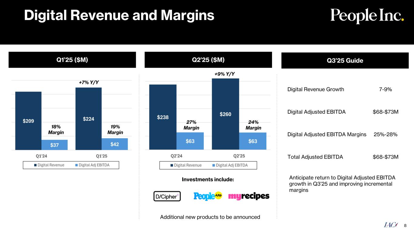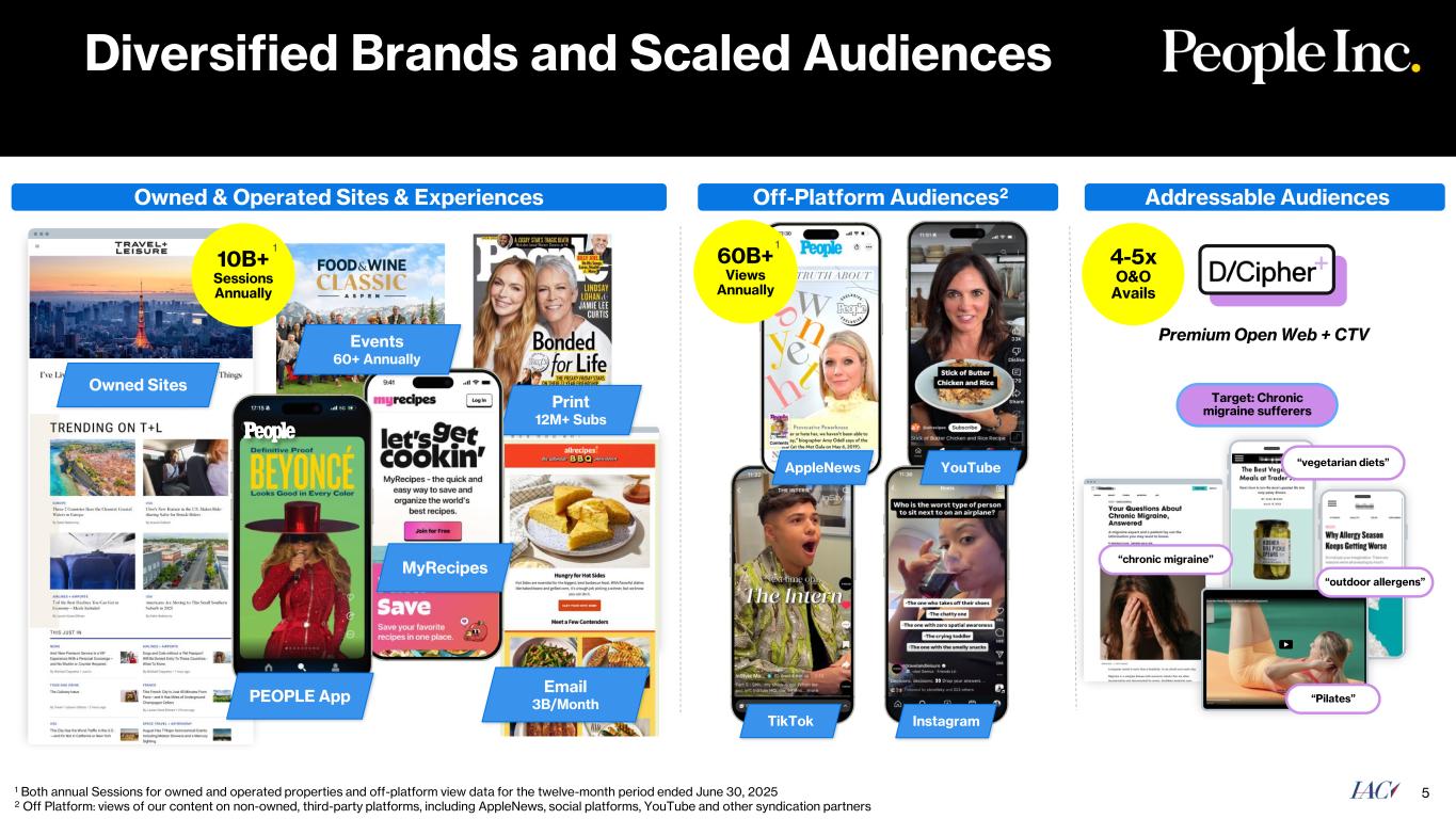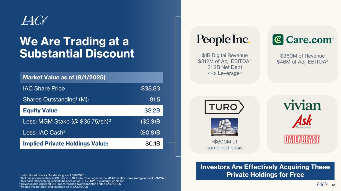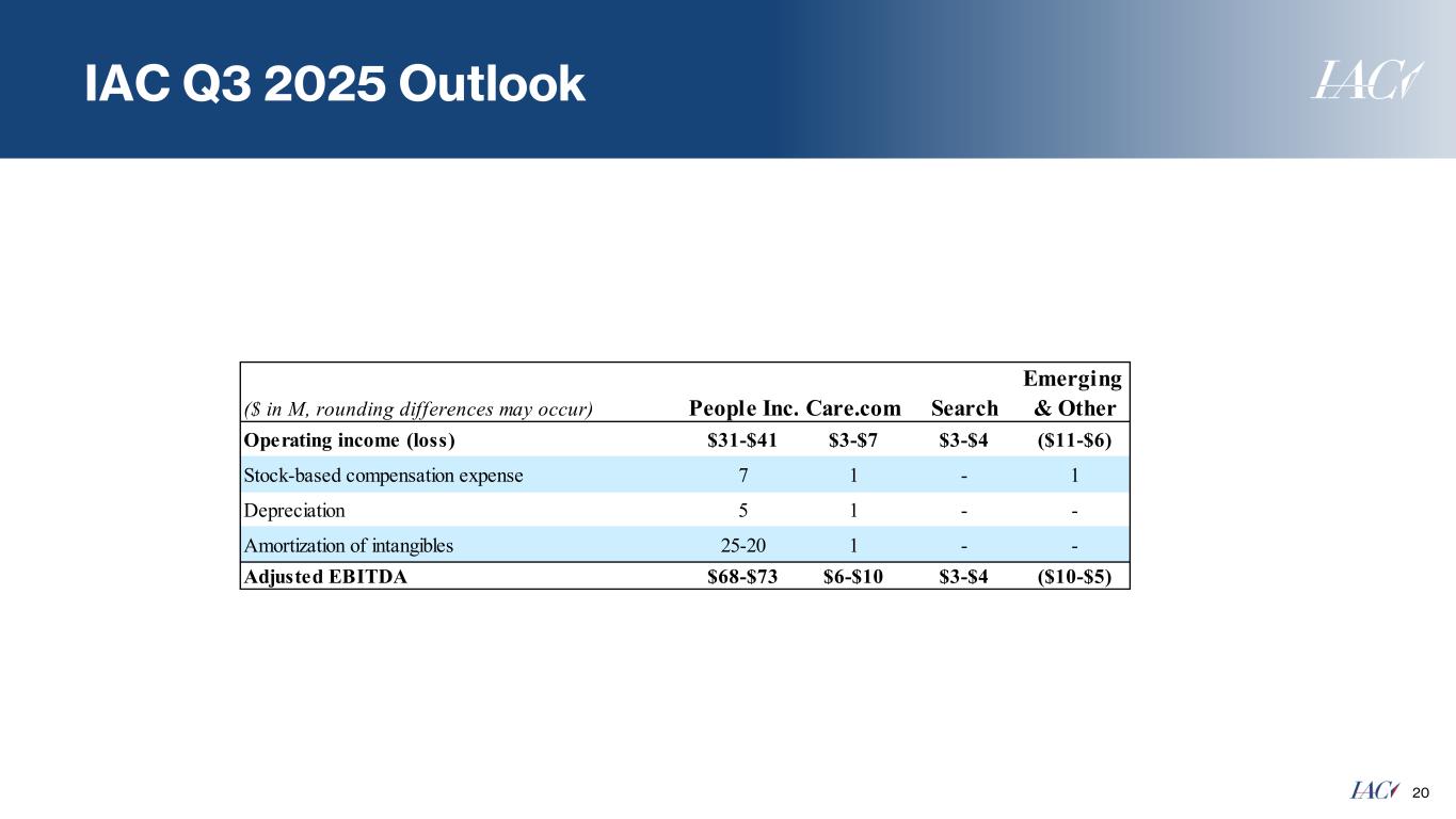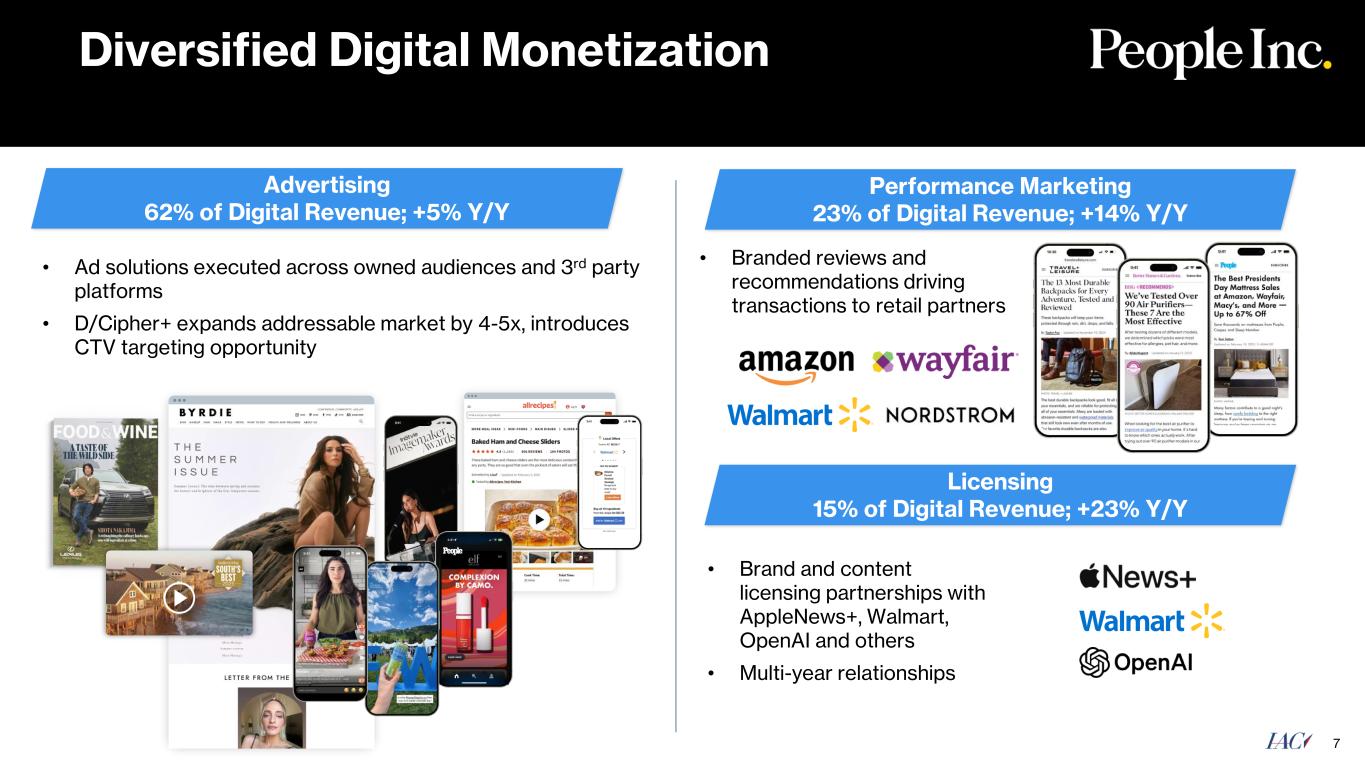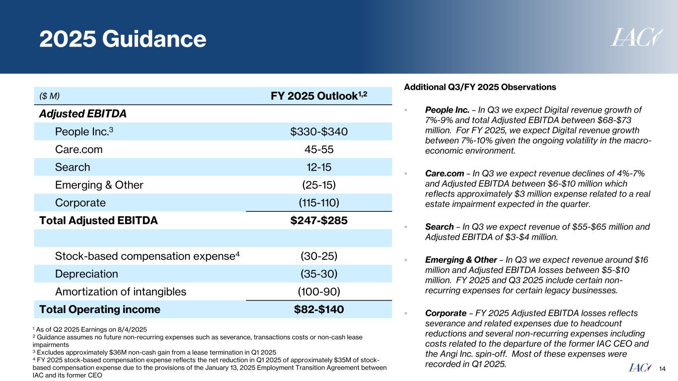 NON-GAAP FINANCIAL MEASURES This presentation contains references to non-GAAP measures. Adjusted EBITDA (Adjusted Earnings Before Interest, Taxes, Depreciation and Amortization) is defined as operating income excluding: (1) stock-based compensation expense; (2) depreciation; and (3) acquisition-related items consisting of (i) amortization of intangible assets and impairments of goodwill and intangible assets, if applicable, and (ii) gains and losses recognized on changes in the fair value of contingent consideration arrangements, if applicable. The reconciliations between GAAP measures and non-GAAP measures are included in the Appendix to this presentation. FORWARD-LOOKING STATEMENTS This presentation may contain "forward-looking statements" within the meaning of the Private Securities Litigation Reform Act of 1995. The use of words such as "anticipates," "estimates," "expects," "plans," “guidance” and "believes," among others, generally identify forward-looking statements. These forward-looking statements include, among others, statements relating to: the future financial performance of IAC and its businesses, the rebrand of Dotdash Meredith as People Inc., business prospects and strategy, anticipated trends and prospects in the industries in which IAC’s businesses operate and other similar matters. Actual results could differ materially from those contained in these forward- looking statements for a variety of reasons, including, among others: (i) our ability to compete with generative artificial intelligence technology and the related disruption to marketing technologies and the publishing industry, (ii) unstable market and economic conditions (particularly those that adversely impact advertising spending levels and consumer confidence and spending behavior), either generally and/or in any of the markets in which our businesses operate, as well as geopolitical conflicts, (iii) our ability to market our products and services in a successful and cost-effective manner, (iv) the display prominence of links to websites offering our products and services in search results, (v) changes in our relationship with (or policies implemented by) Google, (vi) the failure or delay of the markets and industries in which our businesses operate to migrate online and the continued growth and acceptance of online products and services as effective alternatives to traditional products and services, (vii) our continued ability to develop and monetize versions of our products and services for mobile and other digital devices, (viii) the ability of our Digital business to successfully expand the digital reach of our portfolio of publishing brands, (ix) our continued ability to market, distribute and monetize our products and services through search engines, digital app stores, advertising networks and social media platforms, (x) risks related to our Print business including declining revenue, increases in paper and postage costs, reliance on a single supplier to print our magazines and potential increases in pension plan obligations, (xi) our ability to establish and maintain relationships with quality and trustworthy caregivers, (xii) our ability to access, collect, use and protect the personal data of our users and subscribers, (xiii) our ability to engage directly with users, subscribers, consumers and caregivers on a timely basis, (xiv) the ability of our Chairman and Senior Executive and certain members of his family to exercise significant influence over the composition of our board of directors, matters subject to stockholder approval and our operations, (xv) risks related to our liquidity and indebtedness (the impact of our indebtedness on our ability to operate our business, our ability to generate sufficient cash to service our indebtedness and interest rate risk), (xvi) our inability to freely access the cash of People Inc. and its subsidiaries, (xvii) dilution with respect to investments in IAC, (xviii) our ability to compete, (xix) our ability to build, maintain and/or enhance our various brands, (xx) our ability to protect our systems, technology and infrastructure from cyberattacks (including cyberattacks experienced by third parties with whom we do business), (xxi) the occurrence of data security breaches and/or fraud, (xxii) increased liabilities and costs related to the processing, storage, use and disclosure of personal and confidential user information, (xxiii) the integrity, quality, efficiency and scalability of our systems, technology and infrastructure (and those of third parties with whom we do business), (xxiv) changes in key personnel and risks related to leadership transitions and (xxv) changes to our capital deployment strategy. Certain of these and other risks and uncertainties are described in IAC’s filings with the Securities and Exchange Commission (the “SEC”), including the most recent Annual Report on Form 10-K filed with the SEC on February 28, 2025, and subsequent reports that IAC files with the SEC. Other unknown or unpredictable factors that could also adversely affect IAC's business, financial condition and results of operations may arise from time to time. It is not possible for our management to predict all risks, nor can we assess the impact of all factors on our business or the extent to which any factor, or combination of factors, may cause actual results to differ materially from those expressed in any forward-looking statements we may make. Except as required by law, we undertake no obligation to update any forward-looking statements to reflect events or circumstances after the date of such statements. You should, therefore, not rely on these forward-looking statements as representing our views as of any date subsequent to the date of this presentation. MARKET AND INDUSTRY DATA We obtained the market and certain other data used in this presentation from our own research, surveys or studies conducted by third parties and industry or general publication