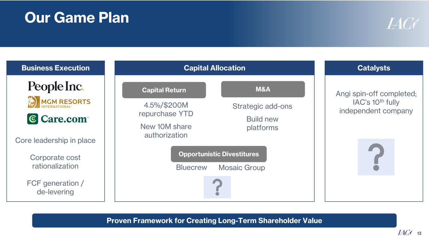 12 We Are Trading at a Substantial Discount Market Value as of (8/1/2025) IAC Share Price $38.83 Shares Outstanding¹ (M): 81.5 Equity Value $3.2B Less: MGM Stake (@ $35.75/sh)2 ($2.3)B Less: IAC Cash3 ($0.8)B Implied Private Holdings Value: $0.1B 1 Fully Diluted Shares Outstanding as of 8/1/2025 2 IAC has approximately $800 million in NOLs to offset against the MGM taxable unrealized gain as of 8/1/2025 3 IAC cash and cash equivalents balance as of 6/30/2025, excluding People Inc. 4 Revenue and Adjusted EBITDA for trailing twelve months ended 6/30/2025 5 People Inc. net debt and leverage as of 6/30/2025 $1B Digital Revenue $312M of Adj. EBITDA4 $1.2B Net Debt <4x Leverage5 $360M of Revenue $46M of Adj. EBITDA4 ~$600M of combined basis Investors Are Effectively Acquiring These Private Holdings for Free