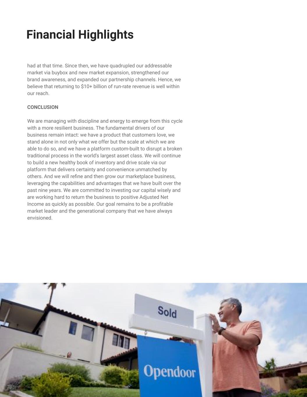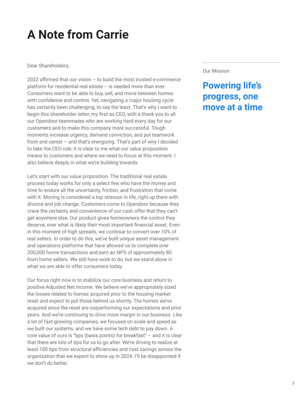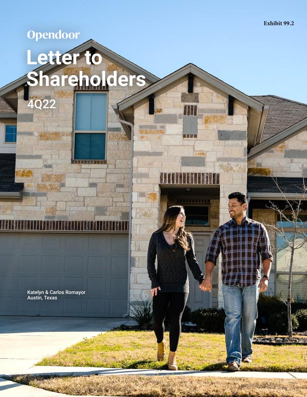 Dear Shareholders, 2022 affirmed that our vision – to build the most trusted e-commerce platform for residential real estate – is needed more than ever. Consumers want to be able to buy, sell, and move between homes with confidence and control. Yet, navigating a major housing cycle has certainly been challenging, to say the least. That’s why I want to begin this shareholder letter, my first as CEO, with a thank you to all our Opendoor teammates who are working hard every day for our customers and to make this company more successful. Tough moments increase urgency, demand conviction, and put teamwork front and center – and that’s energizing. That’s part of why I decided to take the CEO role: it is clear to me what our value proposition means to customers and where we need to focus at this moment. I also believe deeply in what we’re building towards. Let’s start with our value proposition. The traditional real estate process today works for only a select few who have the money and time to endure all the uncertainty, friction, and frustration that come with it. Moving is considered a top stressor in life, right up there with divorce and job change. Customers come to Opendoor because they crave the certainty and convenience of our cash offer that they can’t get anywhere else. Our product gives homeowners the control they deserve, over what is likely their most important financial asset. Even in this moment of high spreads, we continue to convert over 10% of real sellers. In order to do this, we’ve built unique asset management and operations platforms that have allowed us to complete over 200,000 home transactions and earn an NPS of approximately 80 from home sellers. We still have work to do, but we stand alone in what we are able to offer consumers today. Our focus right now is to stabilize our core business and return to positive Adjusted Net Income. We believe we’ve appropriately sized the losses related to homes acquired prior to the housing market reset and expect to put those behind us shortly. The homes we’ve acquired since the reset are outperforming our expectations and prior years. And we’re continuing to drive more margin in our business. Like a lot of fast-growing companies, we focused on scale and speed as we built our systems, and we have some tech debt to pay down. A core value of ours is “bps (basis points) for breakfast” – and it is clear that there are lots of bps for us to go after. We’re driving to realize at least 100 bps from structural efficiencies and cost savings across the organization that we expect to show up in 2024. I’ll be disappointed if we don’t do better. 2 A Note from Carrie Our Mission Powering life’s progress, one move at a time